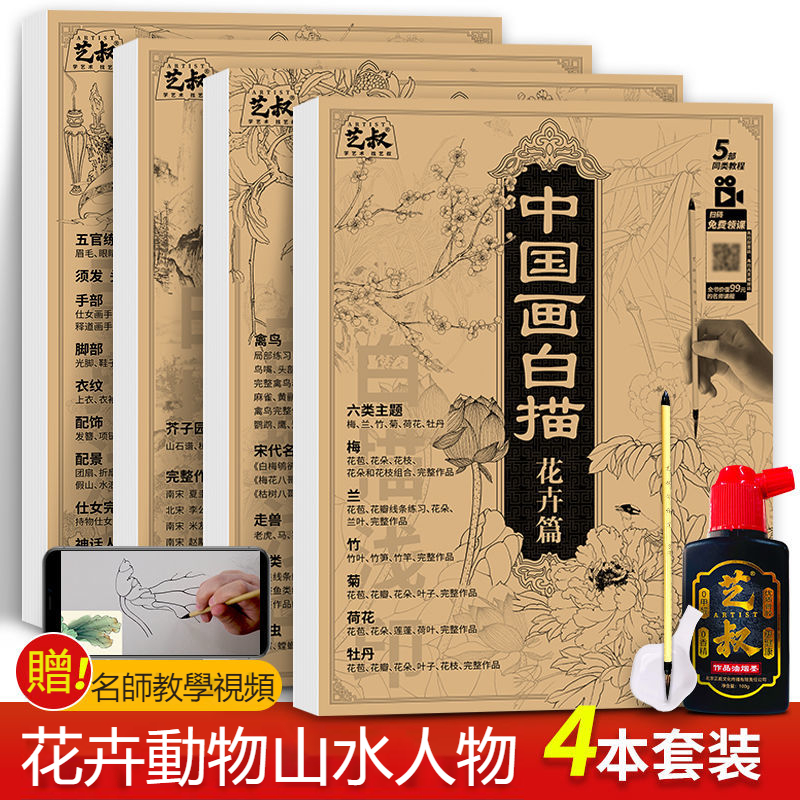 中國畫白描描摹本4本 工筆劃白描底稿臨摹畫冊 動物人物花卉山水