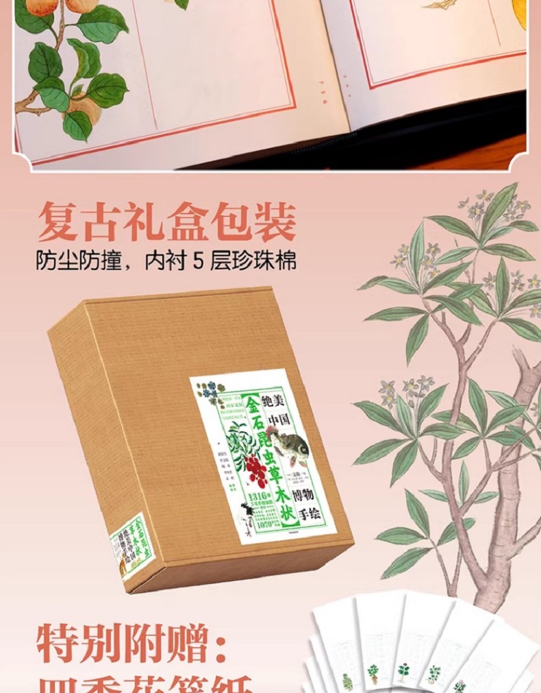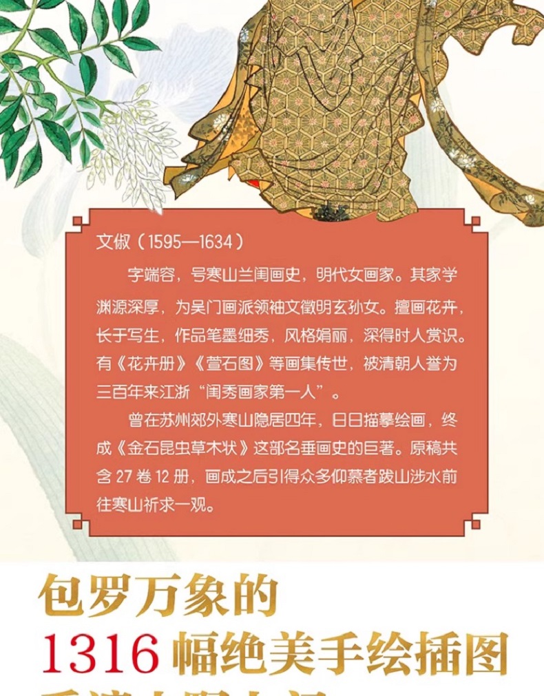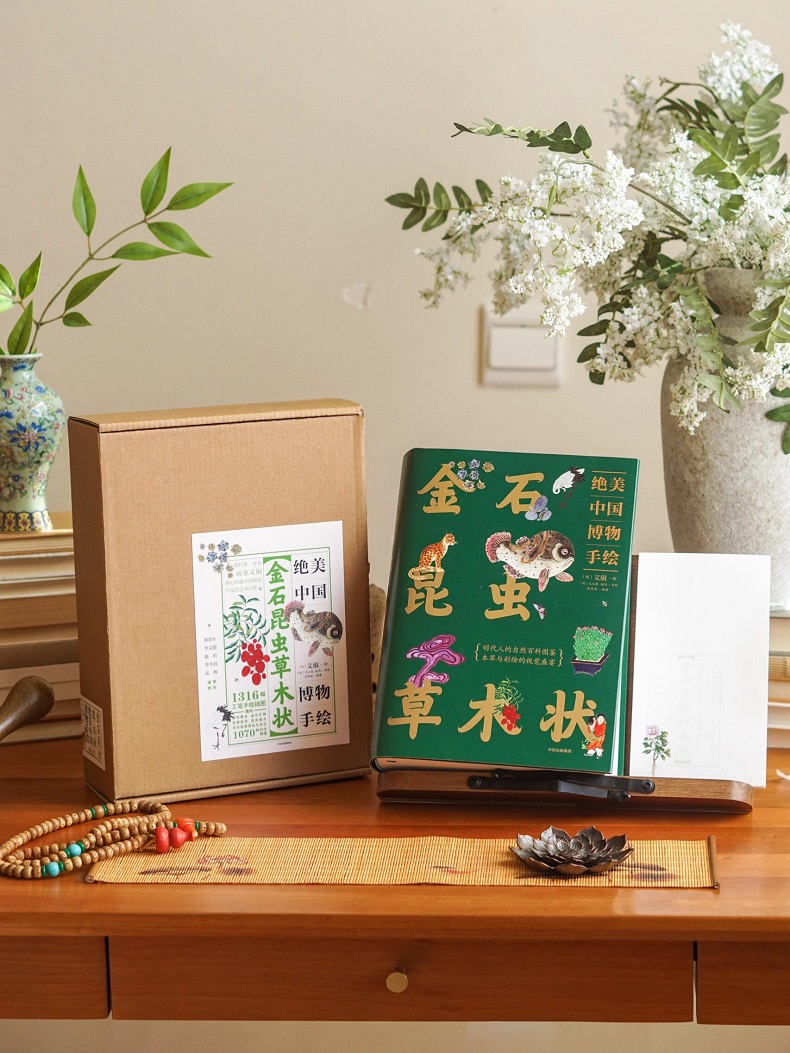 《金石昆蟲草木狀》原為明代著名女畫家、文徵明玄孫女文俶繪製的1316幅博物百科全書圖譜,囊括草木果谷、金石礦物、走獸遊魚、昆蟲禽鳥、煉製工藝等十個大類共1070種古代物事。本次出版完整收錄了原作圖片並重新設計編排,由現代中醫藥科普專家審訂並逐篇撰寫導讀解說。816頁全彩精裝,為讀者提供美感愉悅、弘揚傳統文化的同時,也頗具收藏價值。