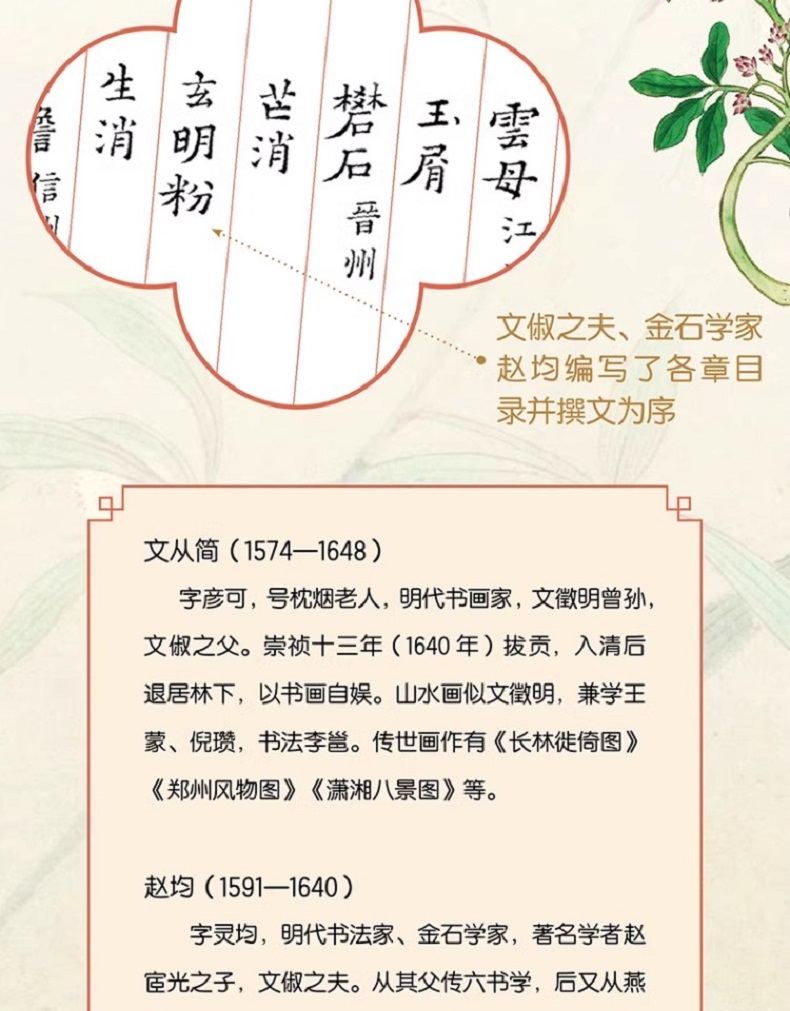 本書主體內容為1316幅精巧雅緻的工筆手繪插圖,由明代一才女畫家文俶依據家藏的宮廷藥典《本草品匯精要》所載類目,在蘇州郊外隱居三年專心描摹而成。其父文從簡是著名書法家,題寫了書中全部的本草名稱;其夫趙均為書法家、金石學家,書寫了序言和各章目錄。全書所繪花草金石溫婉可愛,走獸魚鳥栩栩如生,更有許多古代製藥工藝、冶煉化學場景的生動呈現。它是兩千年中醫藥文化與繪畫藝術碰撞而生的結晶,更是古人格物致知、以藝術寄託情懷的文物見證。