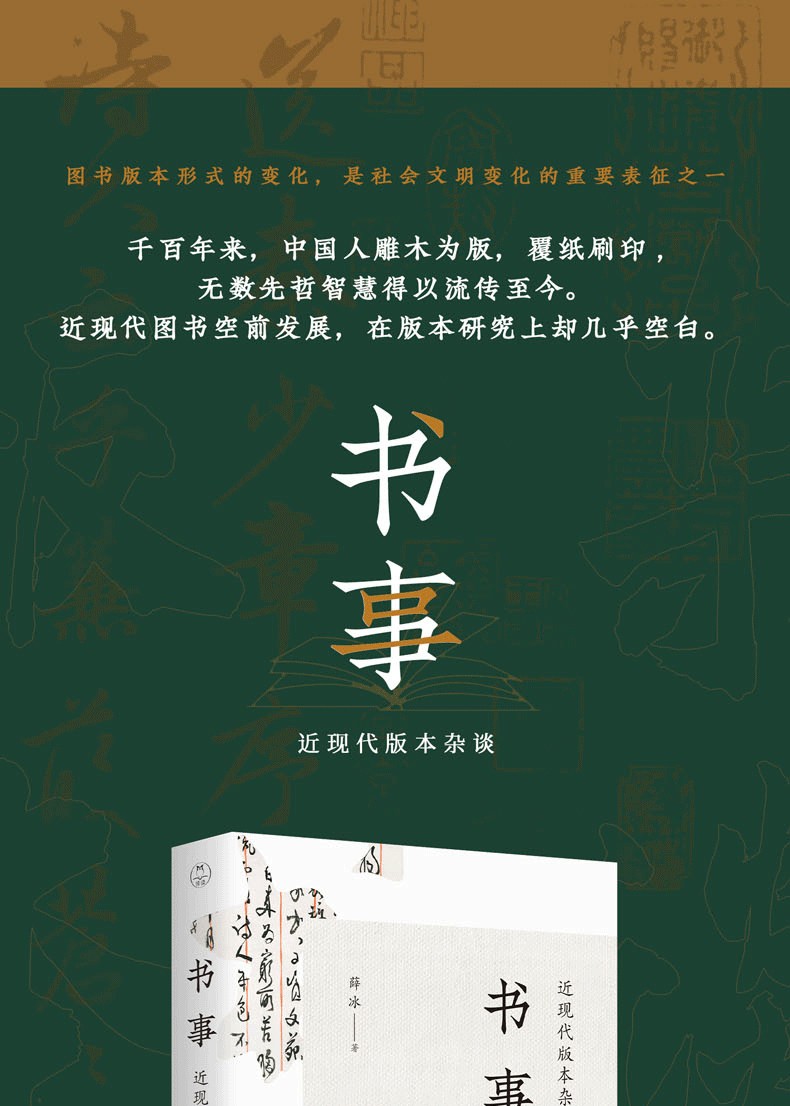 2.《書事:近現代版本雜談》以版本學的基本概念為經,以圖書實證為緯,講述著作者生平、出版者情況、流傳與收藏等書前書後的故事,編織近現代中國出版 的宏觀圖景。