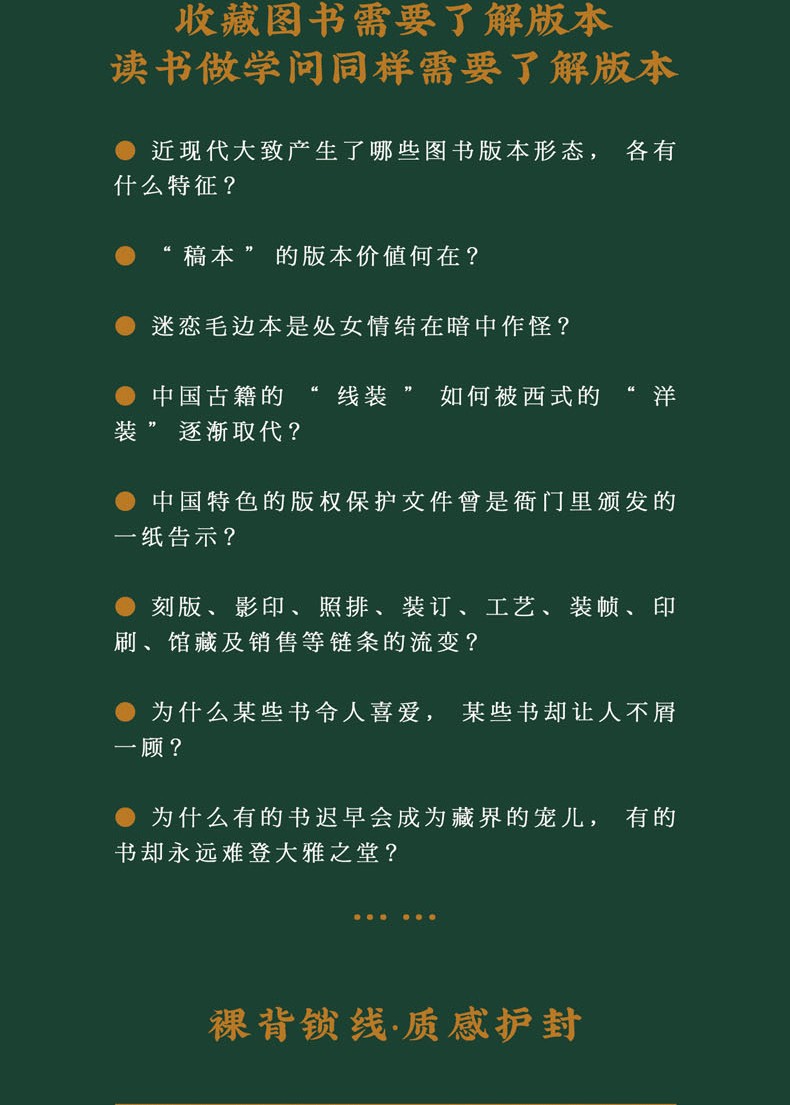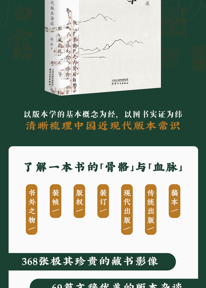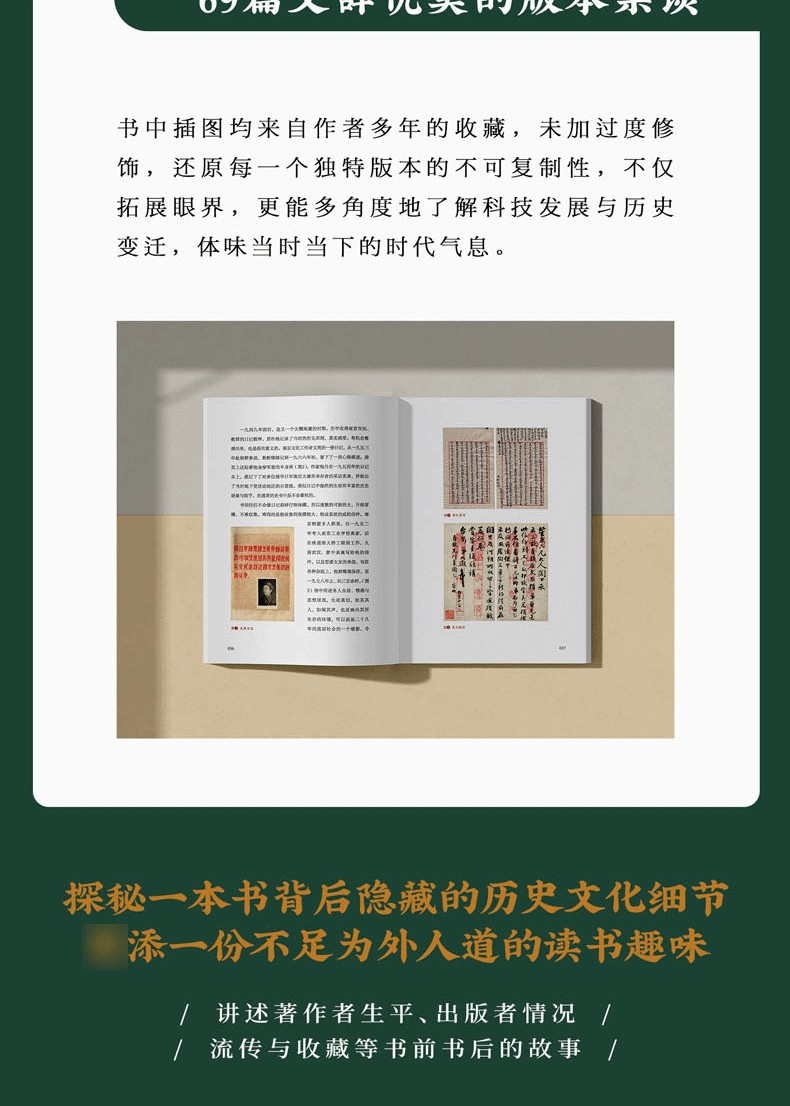 全書分為稿本、傳統出版、現代出版、裝訂、版權、裝幀和書外之物七輯,囊括368張珍貴的藏書影像,69篇文辭優美的版本雜談,清晰梳理中國近現代版本常識,提供 眾多豐富的歷史文化細節。