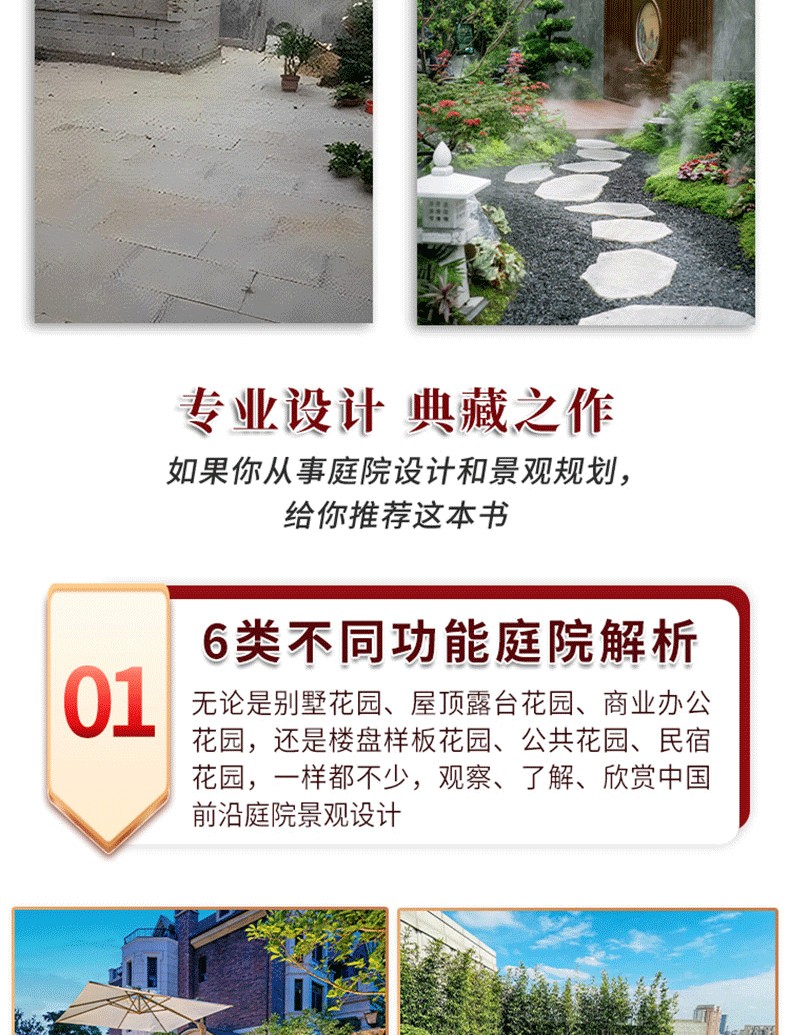 本書優選了國內數十家知名景觀設計公司近期完成的不同風格、具有特色的庭院花園設計案例,分為別墅花園、屋頂露台花園、商業會所花園、樣板花園、公共花園、民宿花園6大類,共 61個項目進行展示。 每個項目對面積、設計師、設計施工單位、設計困難、設計靈感、設計理念及解決方案均有系統介紹,並挑選了各個花園不同角度的精美圖片進行完整的全景展示或局部呈現,還配 有相應的圖紙為設計師提供直接參考。 對花園設計從業者和別墅、民宿等的業主,均有很好的借鏡意義。 除了紙本版書籍收錄的61個案例,編者也把99個庭院案例製作成了電子版贈送給讀者,使得讀者有更多的實用案例可以參考。