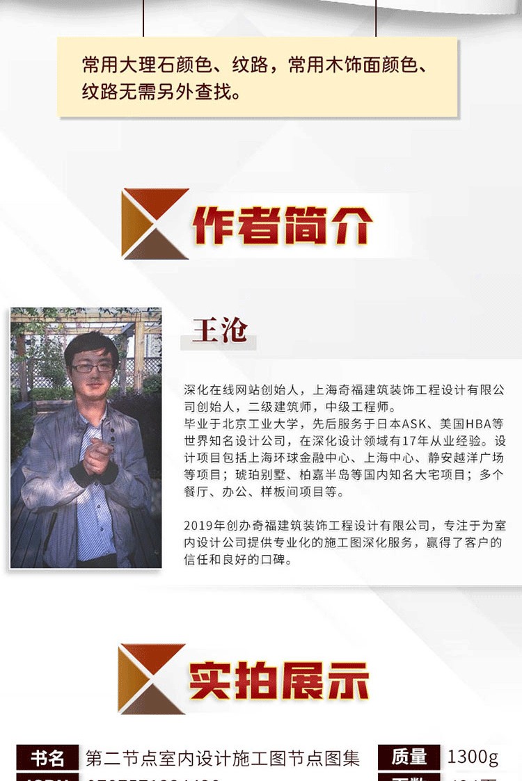 全書包含天花飾面篇、地板飾面篇、牆身飾面篇、牆體構造篇四大類別,共113個室內裝潢關鍵且常用的施工節點。 為方便讀者閱讀,全書採用一個節點一個左右頁對應編排的形式展現,左手頁以直觀的3D圖展示各節點工藝標準、施工順序、材料、規格及規範,身臨其境,通俗易懂;右手 頁對該節點的施工圖繪製過程和標準進行展示,入門新手也能一看即懂。 有效解決了從業人員缺乏工地現場經驗、高品質標準專案經驗、深化設計經驗以及節點圖面繪製規範等難題。 本書旨在為設計師提供一本涵蓋面廣的通用節點工具書,方便大家在設計過程中快速地參考相關的節點工藝,也是入門新手可以跨行業自學的輔導書。