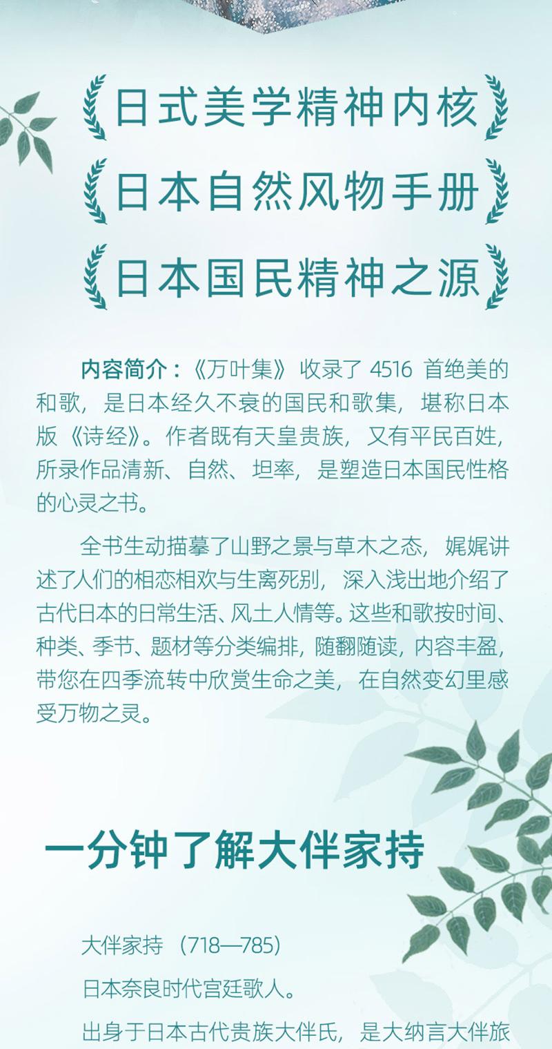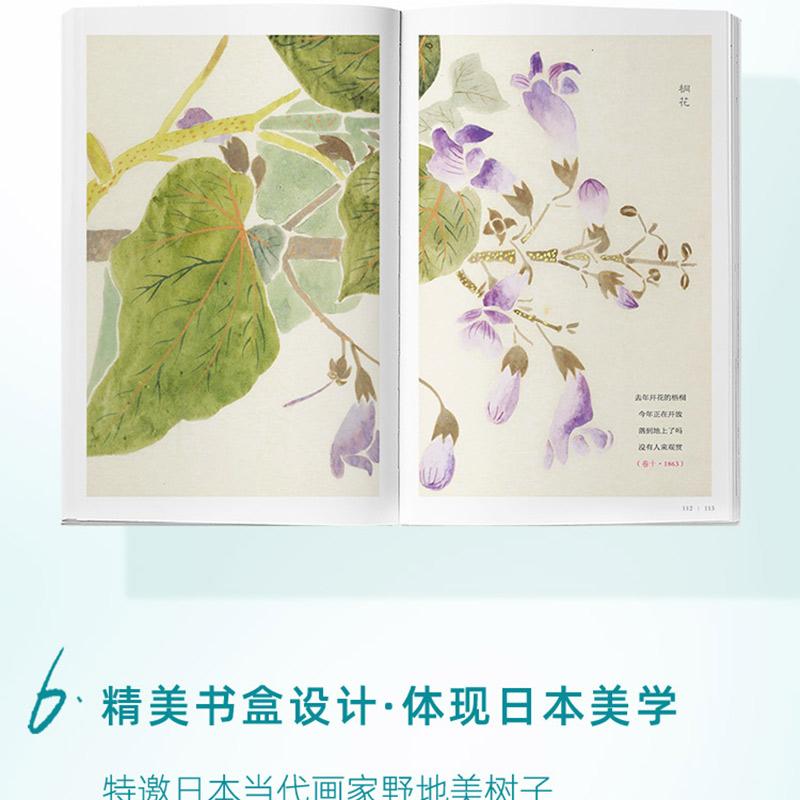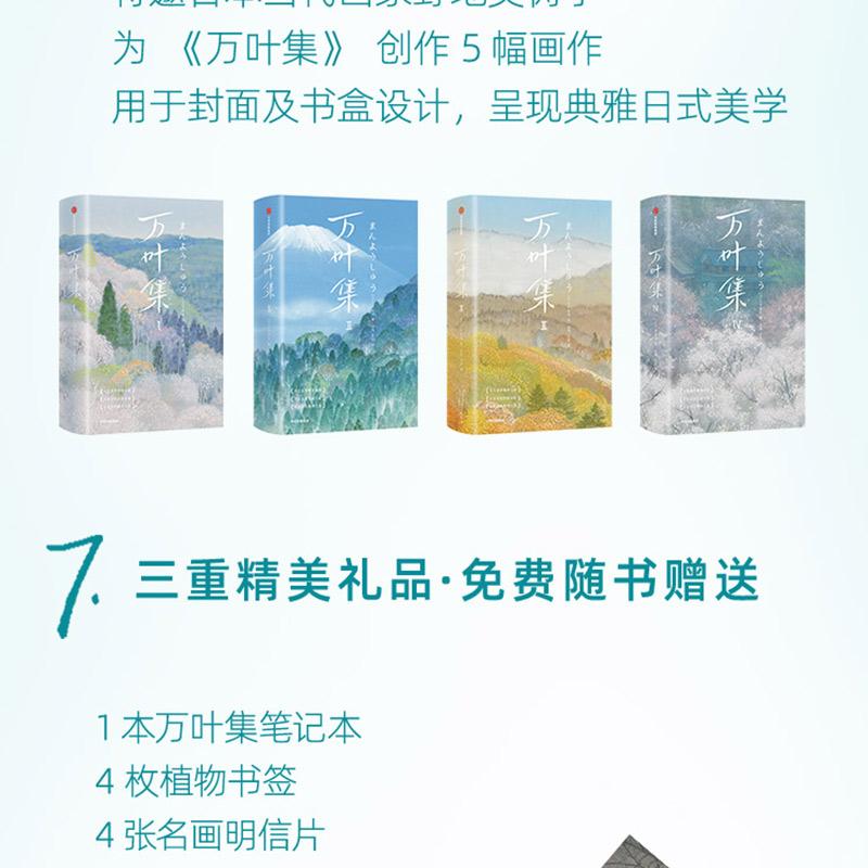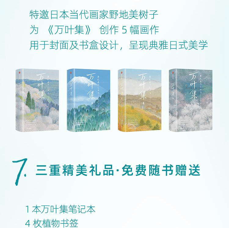 ◆ 精美裝幀設計,體現日本美學:特邀日本當代畫家野地美樹子為《萬葉集》創作6幅畫作,用於封面及書盒設計,呈現典雅日式美學,愛書人常備。