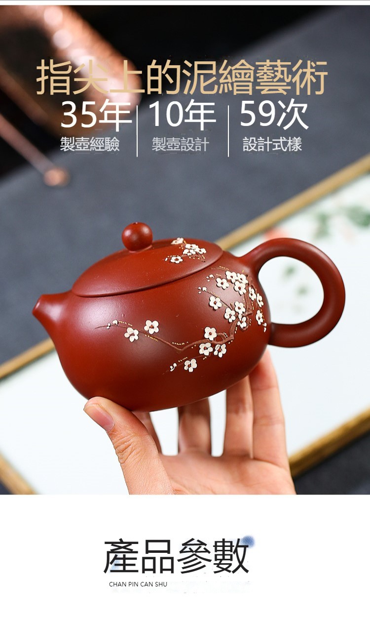 宜興丁蜀鎮原礦紫朱泥手工泥繪扁西施茶壺