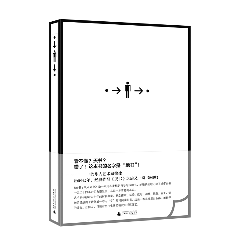 《地書:從點到點》是一本用各類標識語言和符號寫成的書,妙趣橫生地記錄下現代城市白領一天二十四小時的典型生活。 在某種意義上,這是一本奇特的小說。 藝術家徐冰經過七年的材料收集、概念推敲、試驗、改寫、調整、推翻、重來,最初的靈感終於轉化成一件成熟的藝術作品問世。 這是一本沒有使用任何傳統文字的讀物,也是一本在任何地方出版都不用翻譯的書。 無論哪種文化背景,講何種語言,只要有當代生活經驗的人,就可以讀懂這本書。