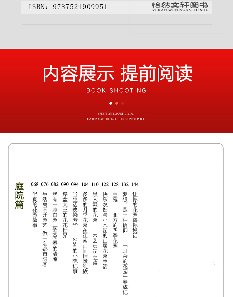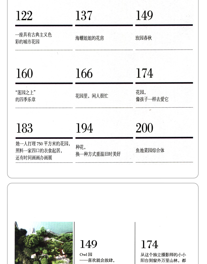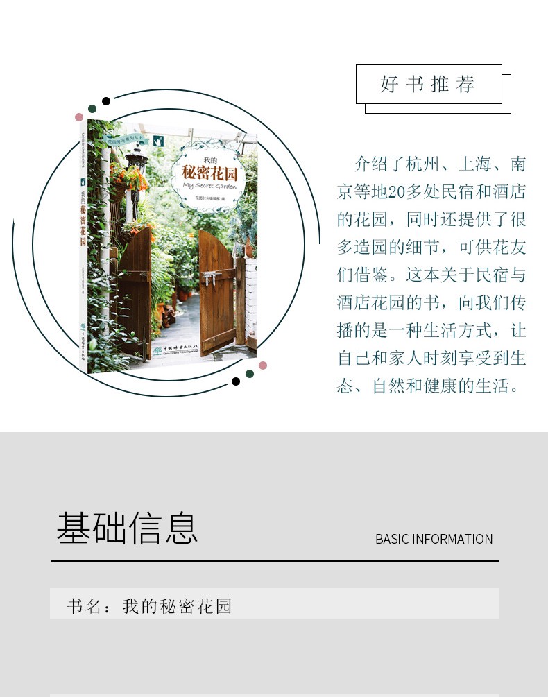 《我的秘密花園/花園時光系列叢書》介紹了杭州、上海、南京等地20多處民宿和酒店的花園,同時還提供了很多造園的細節,可供花友們藉鑑。這本關於民宿與酒店花園的書,向我們傳播的是一種生活方式,讓自己和家人時刻享受到生態、自然和健康的生活。