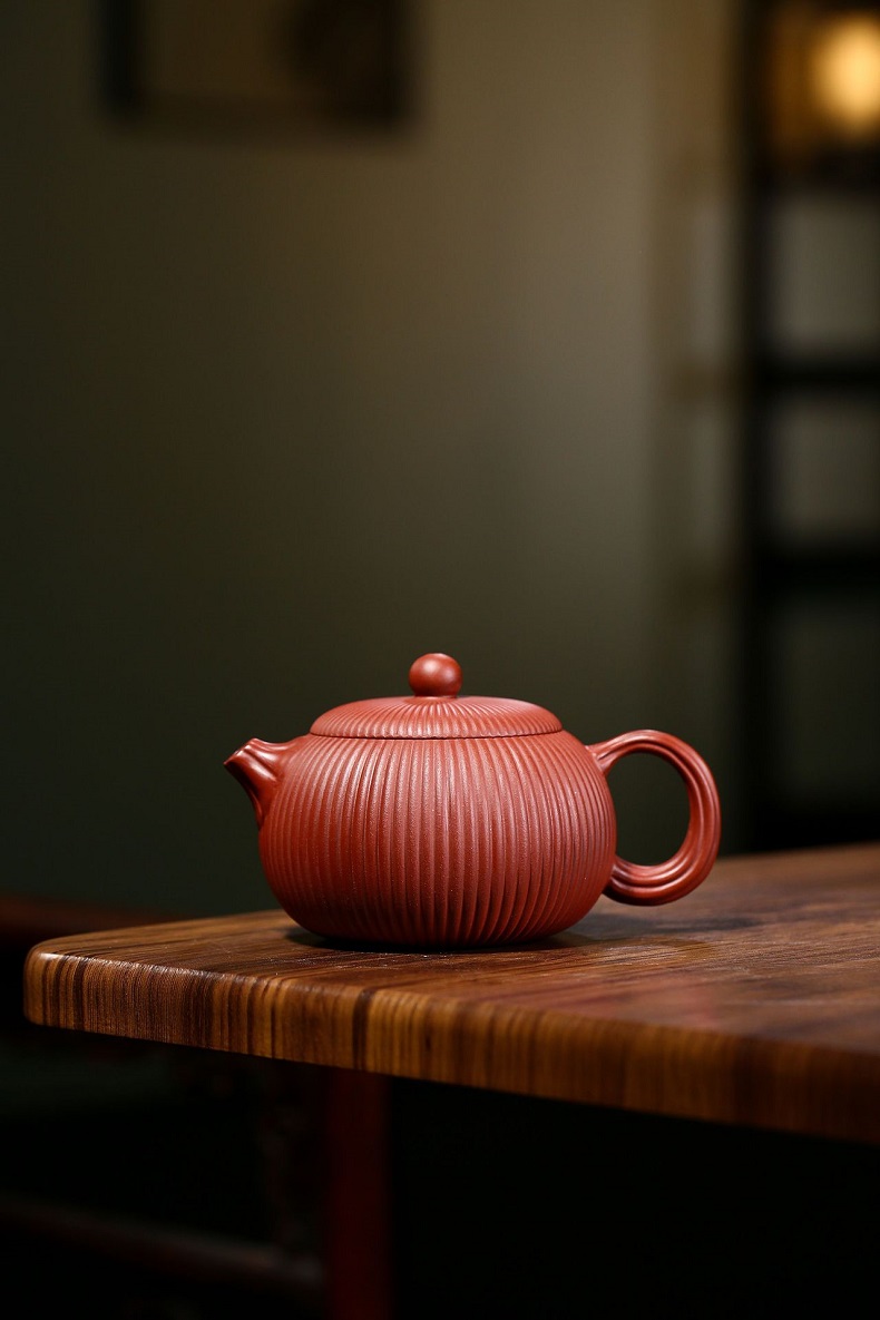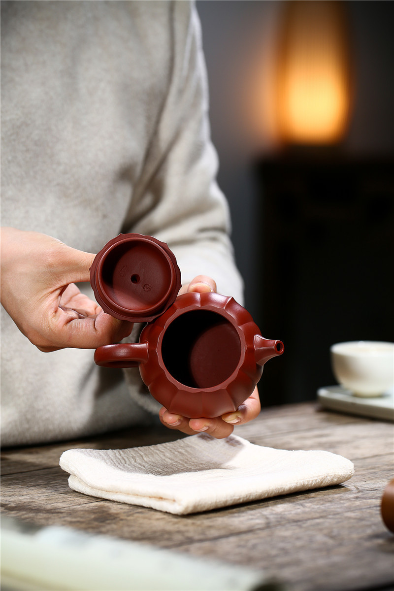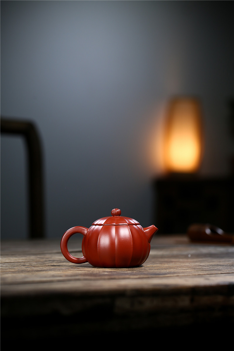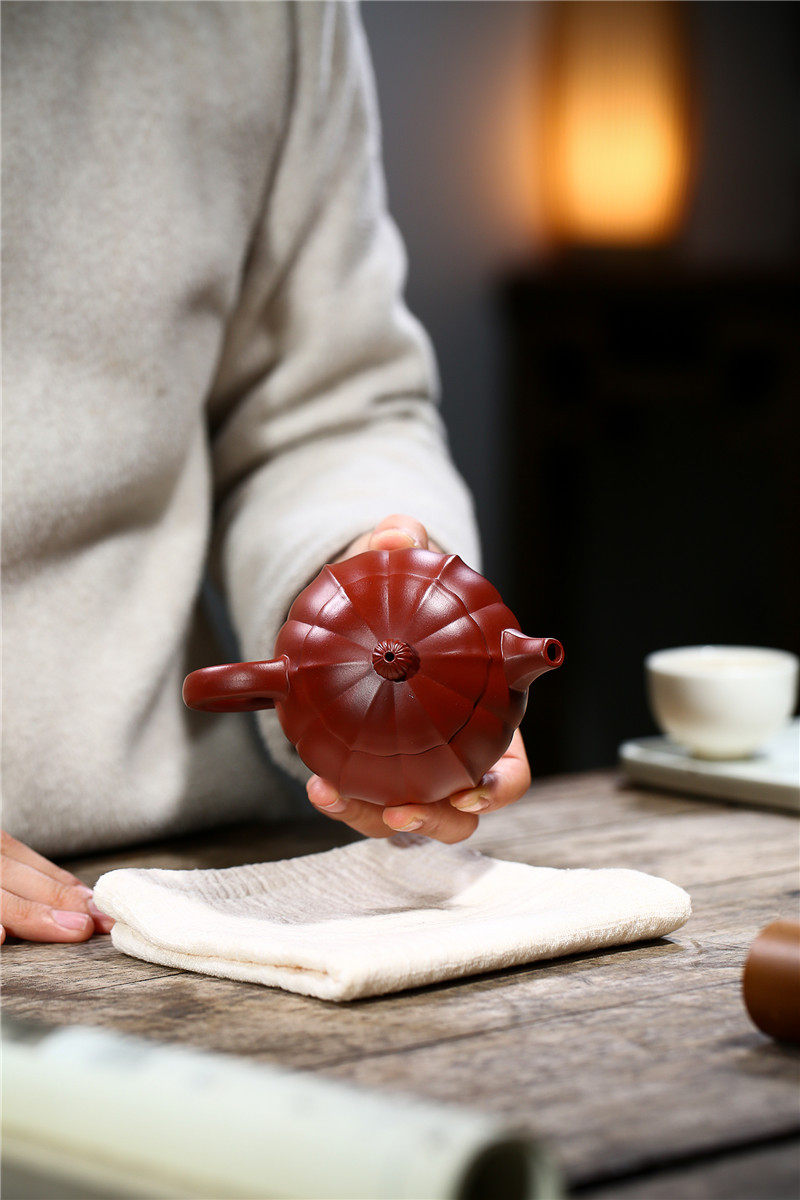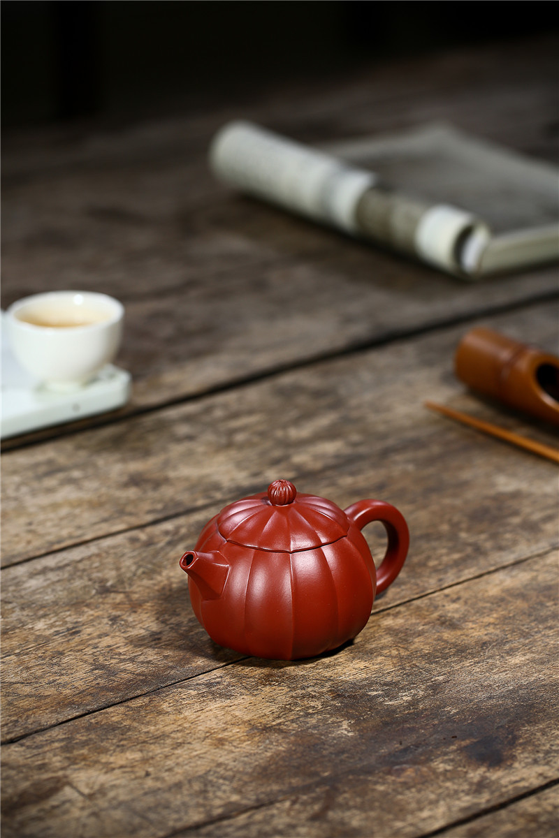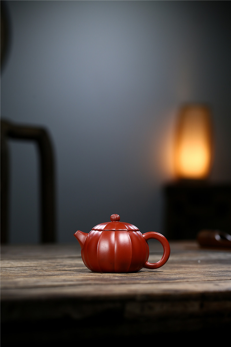 大紅袍南瓜瓣壺原礦紫砂仿古筋紋合菱壺