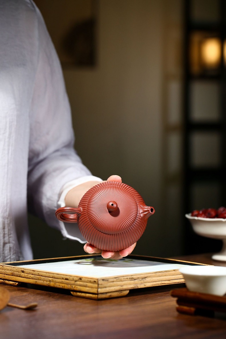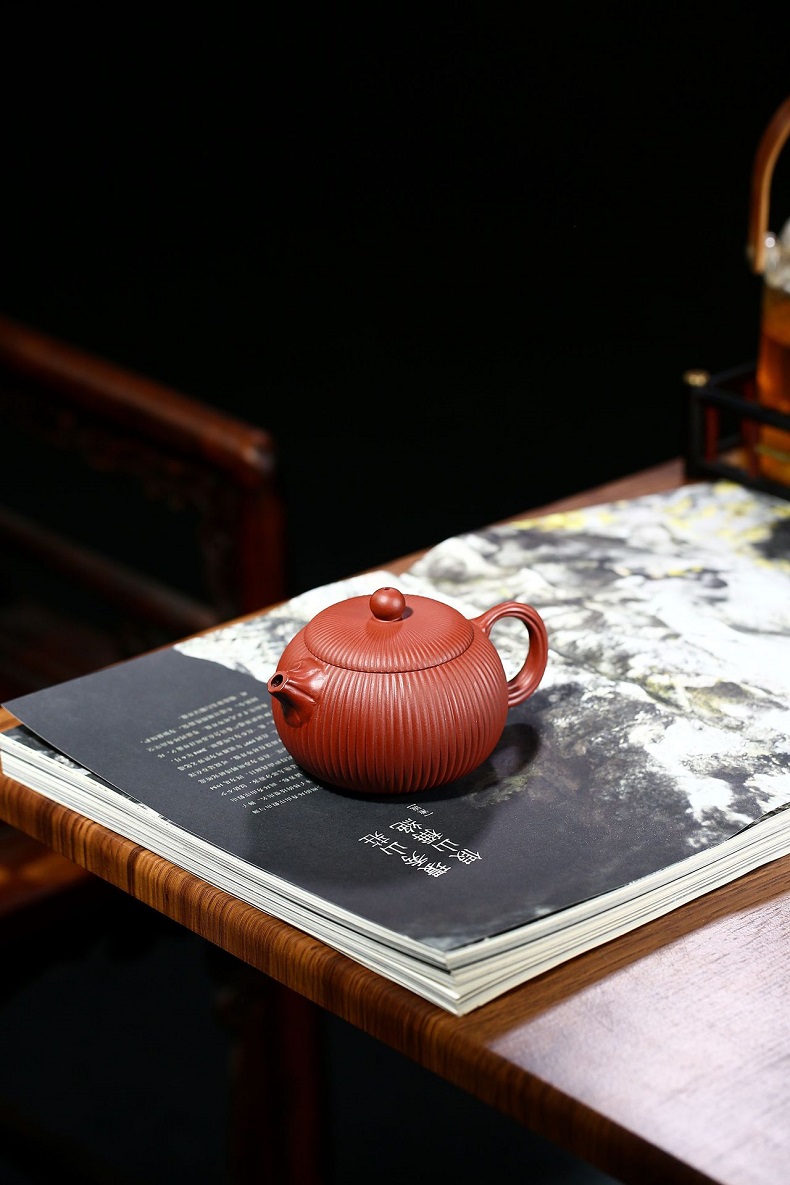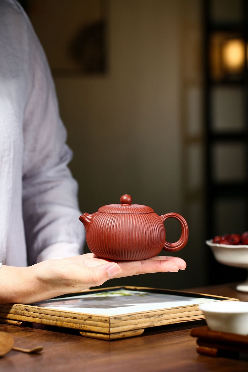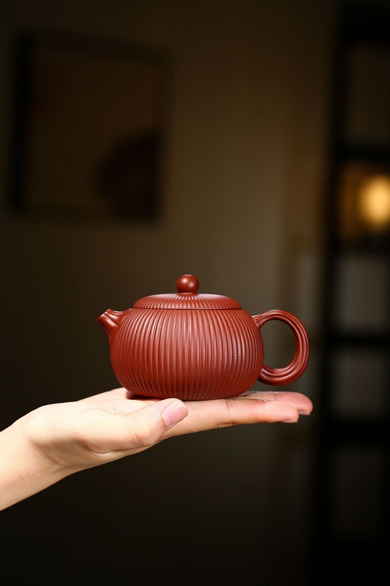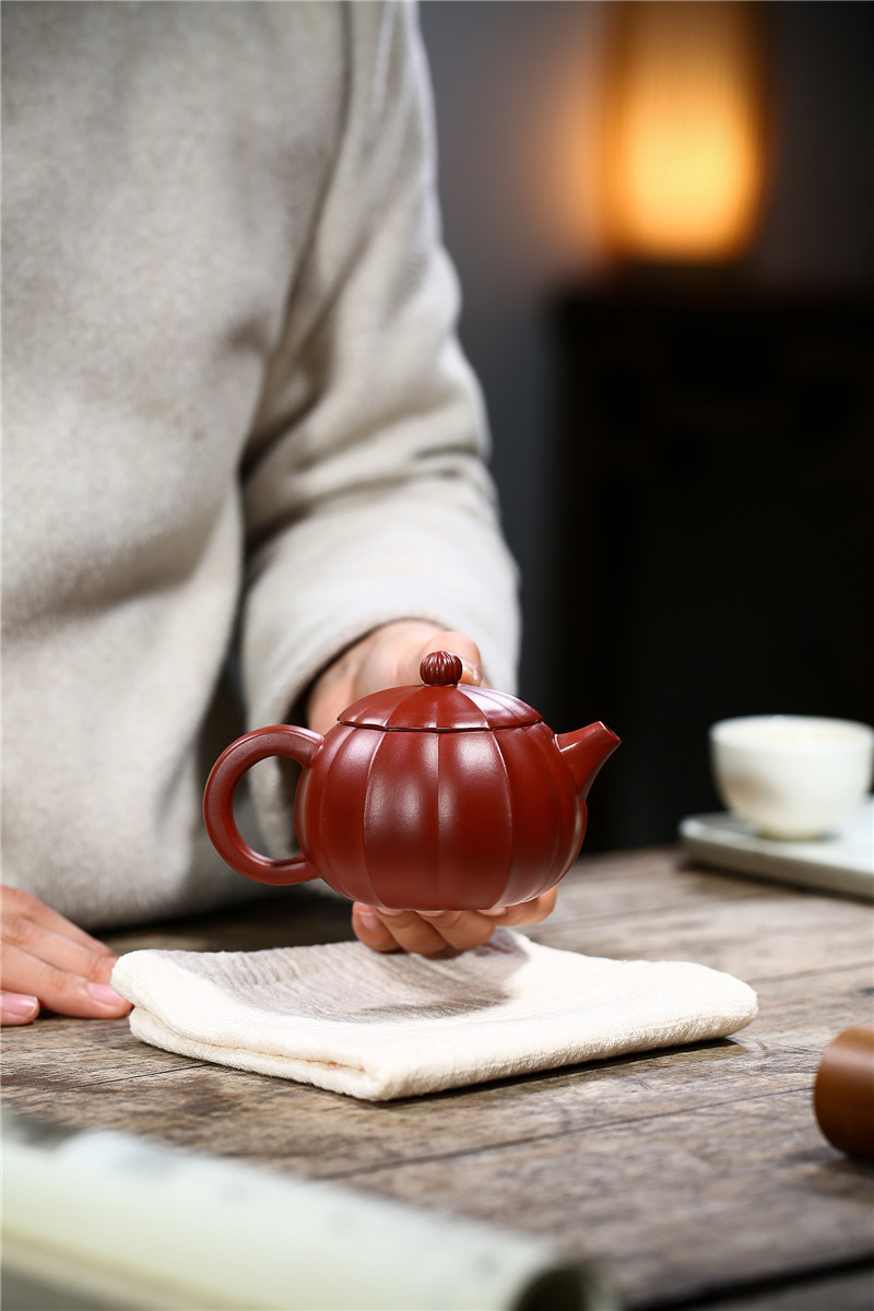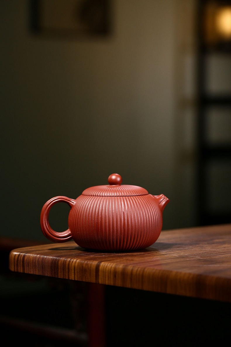 大紅袍南瓜瓣壺原礦紫砂仿古筋紋合菱壺