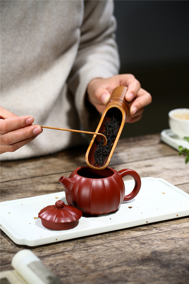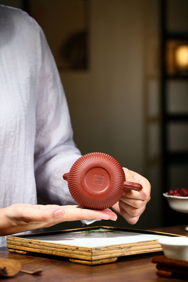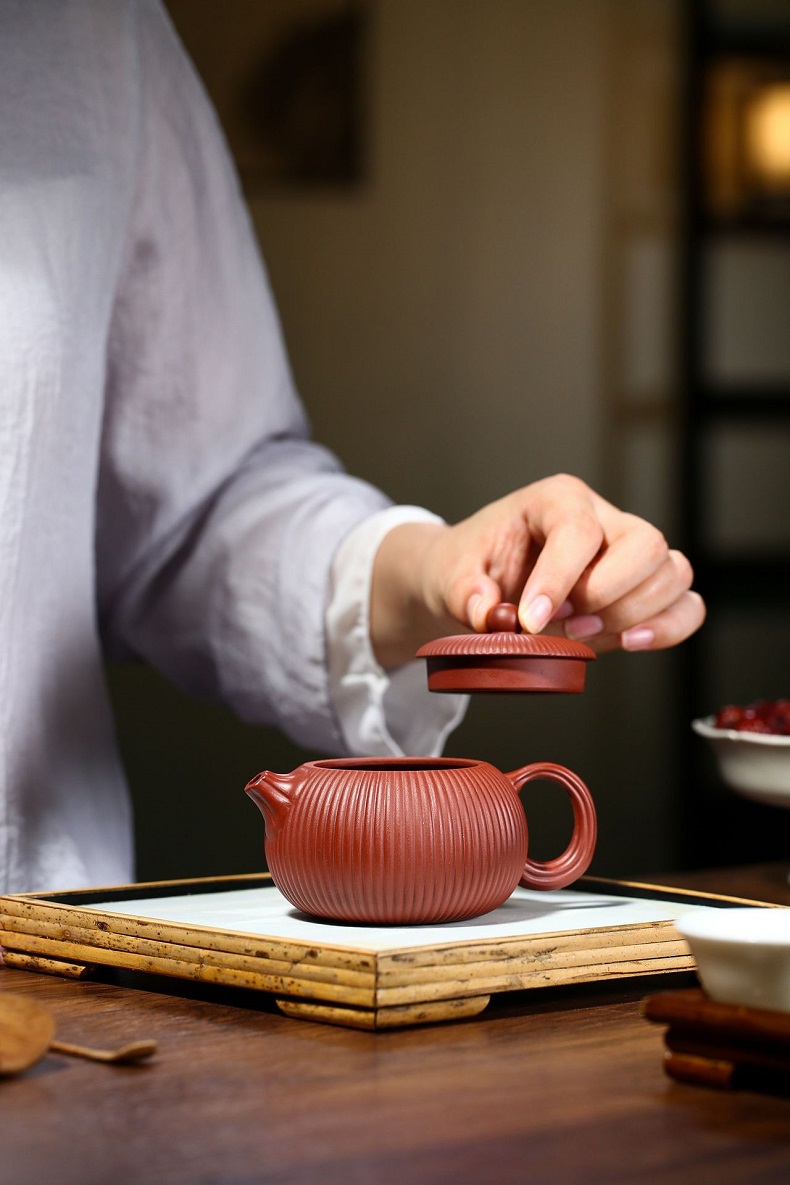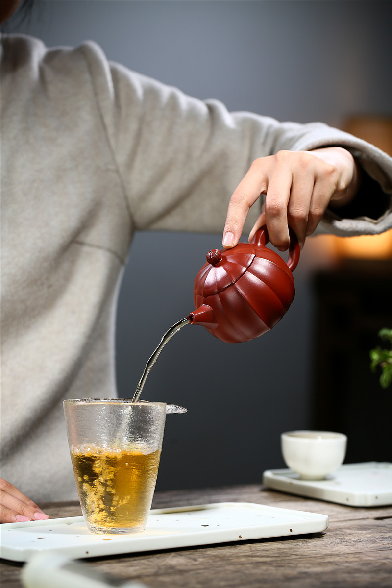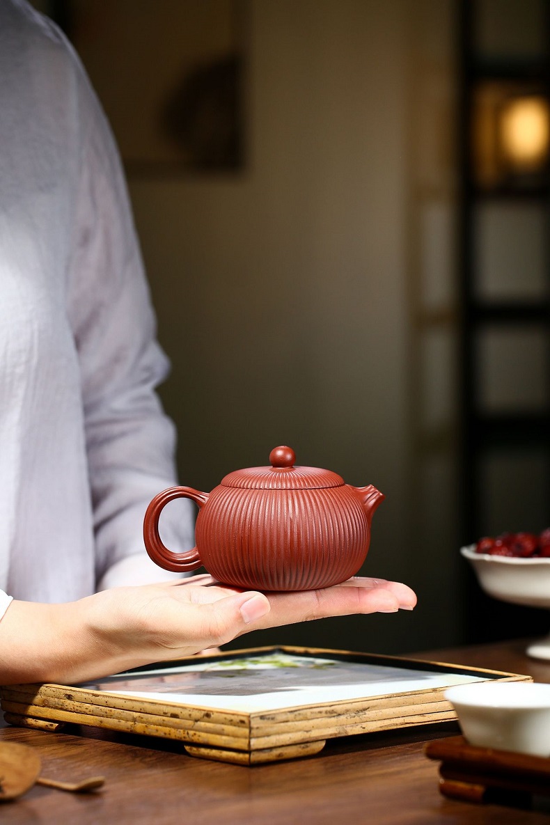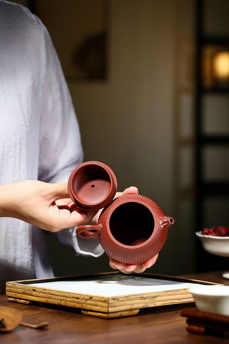 大紅袍南瓜瓣壺原礦紫砂仿古筋紋合菱壺