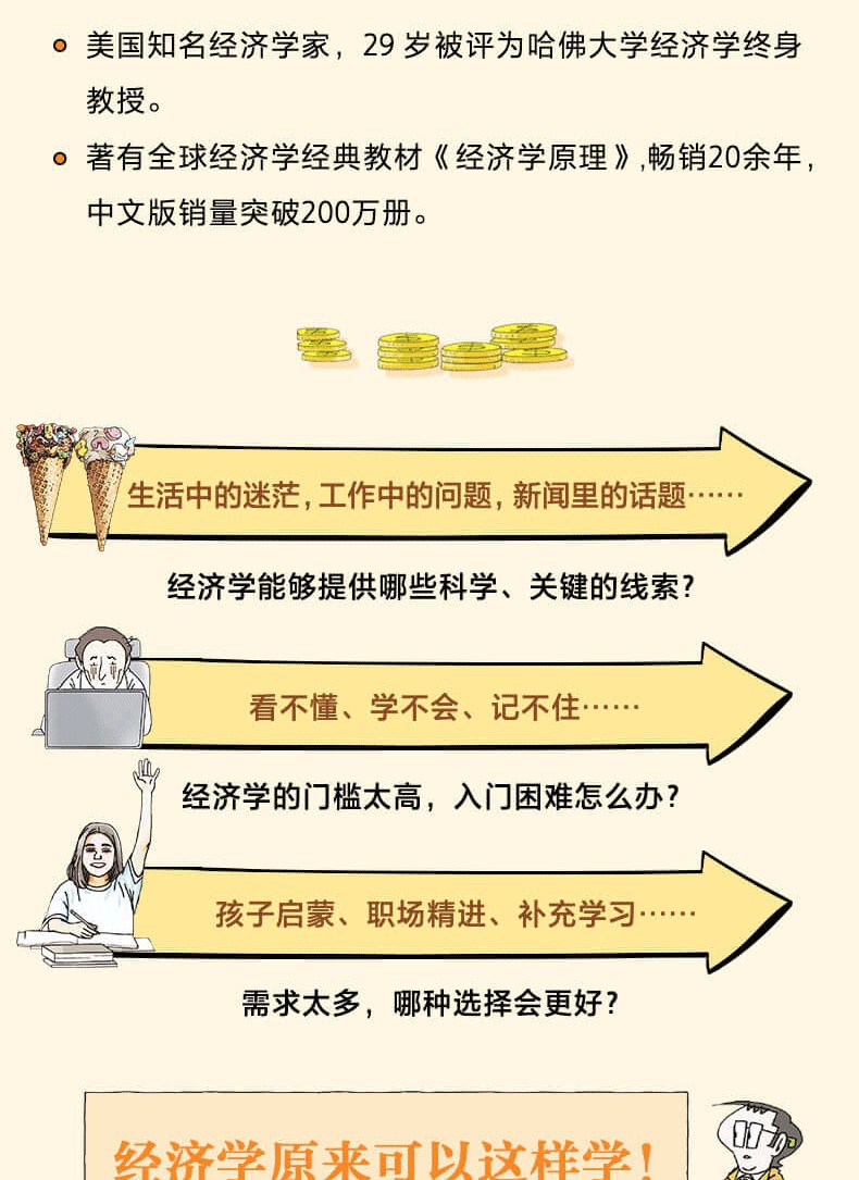 《經濟學原理(漫畫版)》(以下簡稱「漫畫版」)用漫畫的形式把經濟學中深奧的道理通俗而有趣地介紹給讀者,這是這套書的基本特徵。但這套書還有更值得關注的改進,甚至對原版教材進行了延伸與發展,其中許多內容是原版教材沒有的。這些延伸與發展更有利於讀者加深對原理本身和經濟學理論的理解,也更適合讀者把書中的許多理論活學活用。
