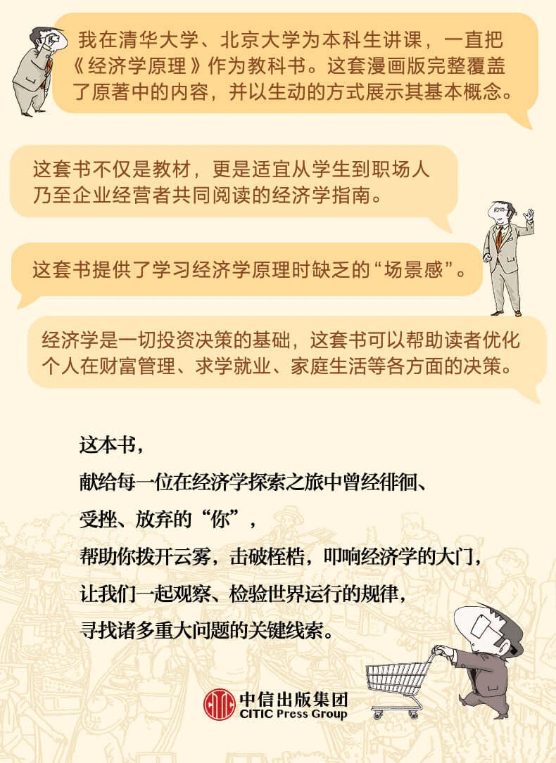 經濟學從不是一門高高在上的學問,它深入而透徹地觀察、研究、高度概括我們的日常生活。在資訊化、知識經濟時代,每個人都應具備一定的經濟學基礎知識,以便更好地應對快速變化的世界,幫助我們做出更明智、更理性的經濟決策,更好地行使公民權利,做出理性、正確的選擇,進而提升社會經濟決策的明智程度。