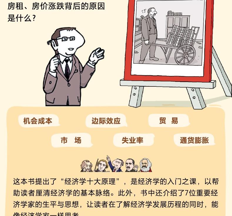 原版教材並沒有涉及經濟學思想史。從寫教科書的角度,這種做法是無可非議的。不過我總覺得,讀者如果能對經濟學發展的歷史有一點了解,這對學習理解經濟學是極有意義的。 《漫畫版》以介紹經濟學家的形式介紹了經濟學的發展,它從亞當·斯密開始,直到今天的諾貝爾經濟學獎得主,介紹了近 20 位經濟學家。對這些經濟學家及其主要貢獻的介紹並不是單獨成章的,而是穿插在不同的相關理論內容中。如果把各部分對相關經濟學家的介紹整合起來,「漫畫版」其實就是一套經濟學思想簡史,特別是集中介紹在經濟學思想史上有重大貢獻的8 位經濟學家那一部分,極有意義。透過對這些經濟學家的介紹,我們可以看出從亞當‧斯密的時代到當代,經濟學不斷前進的歷程。對這些經濟學家的介紹也採用了漫畫的形式,這比閱讀一套經濟學思想的發展簡史要容易得多。漫畫形式使這套書的內容既豐富,又有趣。
