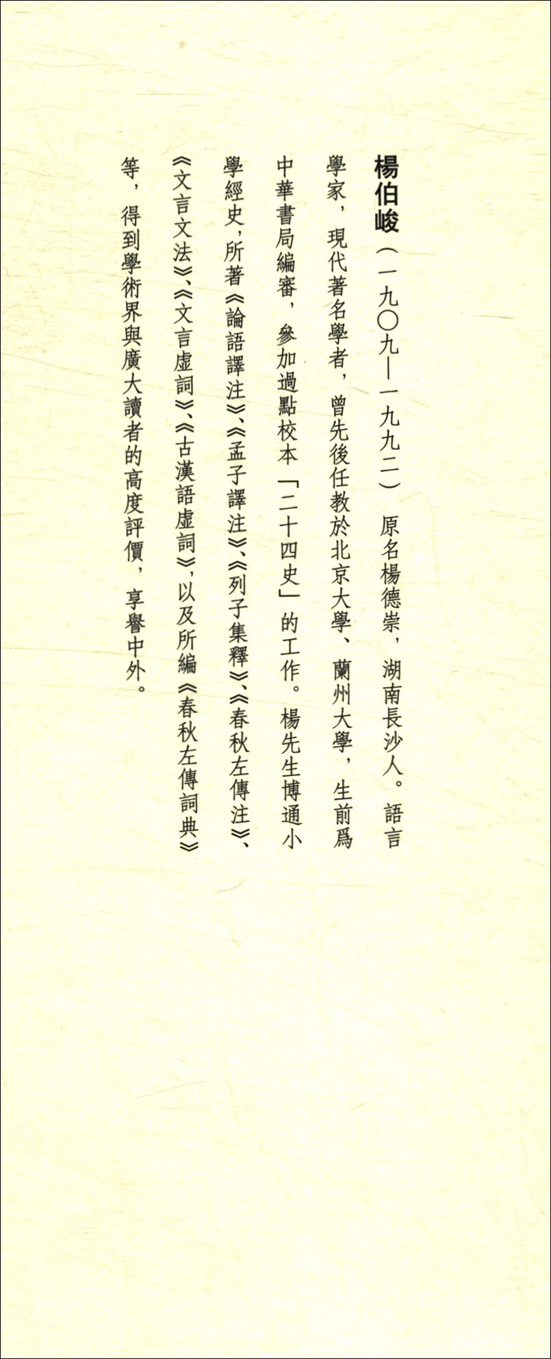 楊伯峻(一九〇九—一九九二),原名楊德崇,湖南長沙人。語言學家,現代有名學者,曾先後任教於北京大學、蘭州大學,生前為中華書局編審,參加過點校本“二十四史”的工作。楊先生博通小學經史,所著《論語譯註》、《孟子譯註》、《列子集釋鑼》《春秋左傳注》、《文言文法》、《文言虛詞》、《古漢語虛詞》,以及所編《春秋左傳詞典》等,得到學術界與廣大讀者的高度評價,享譽中外。