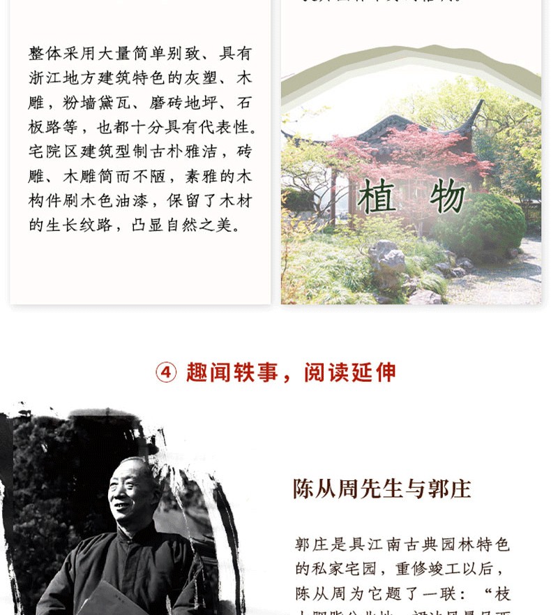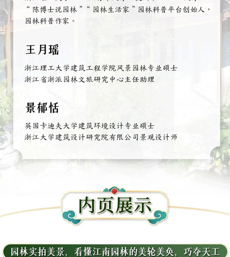 本書是各位作者通力合作的成果,整體構思與學術框架搭建由陳波完成,杭州、溫州部分初稿由王月瑤完成,蘇州、揚州部分初稿由景鬱恬完成,全書由陳波負責統稿。 浙江理工大學風景園林zhuan業碩士研究生康昱、楊翔、劉佳惠、錢釙輝、陸雲舟、閔歡、王許陽、陳慧琳等同學為本書的編寫提供了幫助。 天津鳳凰空間文化傳媒有限公司徐磊編輯為本書的編輯與出版提供了大力支持。 在此,對上述人員一併表示衷心感謝!