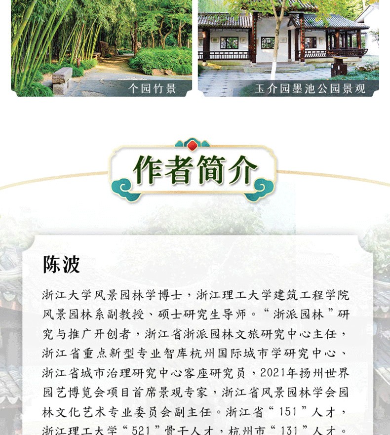 陳波,浙江大學風景園林學博士,浙江理工大學建築工程學院風景園林系副教授、碩士研究生導師。 「浙派園林」研究與推廣開創者,浙江省浙派園林文旅研究中xin主任,浙江省重點新型專業智庫杭州國際城市學研究中心、浙江省城市治理研究中xin客座研究員,2021 年揚州國際城市學研究中心、浙江省城市治理研究中xin客座研究員,2021 年揚州 世界園藝博覽會計畫首席景觀專家,浙江省風景園林學會園林文化藝術專業委員會副主任。 浙江省「151」人才,浙江理工大學「521」骨幹人才,杭州市「131」人才。 「陳博士說園林」「園林生活家」園林科普平台創始人,園林科普作家。