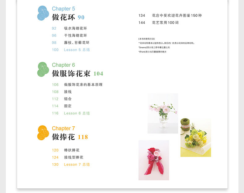 僅用花卉裝飾房間或許讓你覺得略顯乏味,那麼試著做個漂亮的花環又或者將嬌豔的花朵裝飾在衣服上如何?書後更附有150種熱門花卉圖鑑,供你參考與選擇……牢固地掌握本書中的插花基礎技法,讓身為插花初學者的你順利進階“花藝達人”。