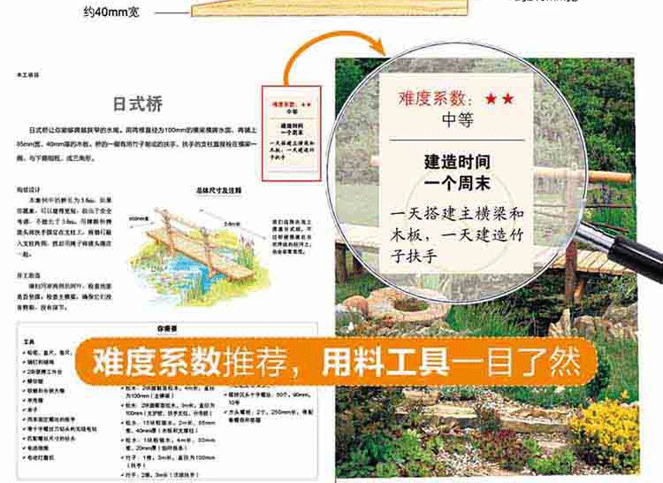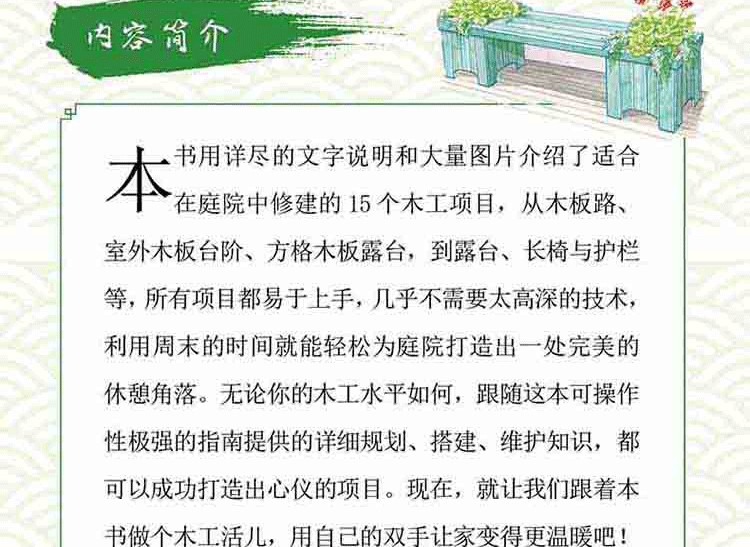 本書以詳盡的文字說明和大量圖片介紹了適合在庭院中修建的15個木工項目,從木板路、室外木板台階、方格木板露台,到露台、長椅與護欄等,所有項目都易於上手, 幾乎不需要太高深的技術,利用週末的時間就能輕鬆為庭院打造出一處**的休憩角落。 無論你的木工等級如何,跟隨這本可操作性極強的指南提供的詳細規劃、搭建、維護知識,都可以成功打造出心儀的項目。 現在,就讓我們跟著本書做個木工活兒,用自己的雙手讓家變得更溫暖吧!