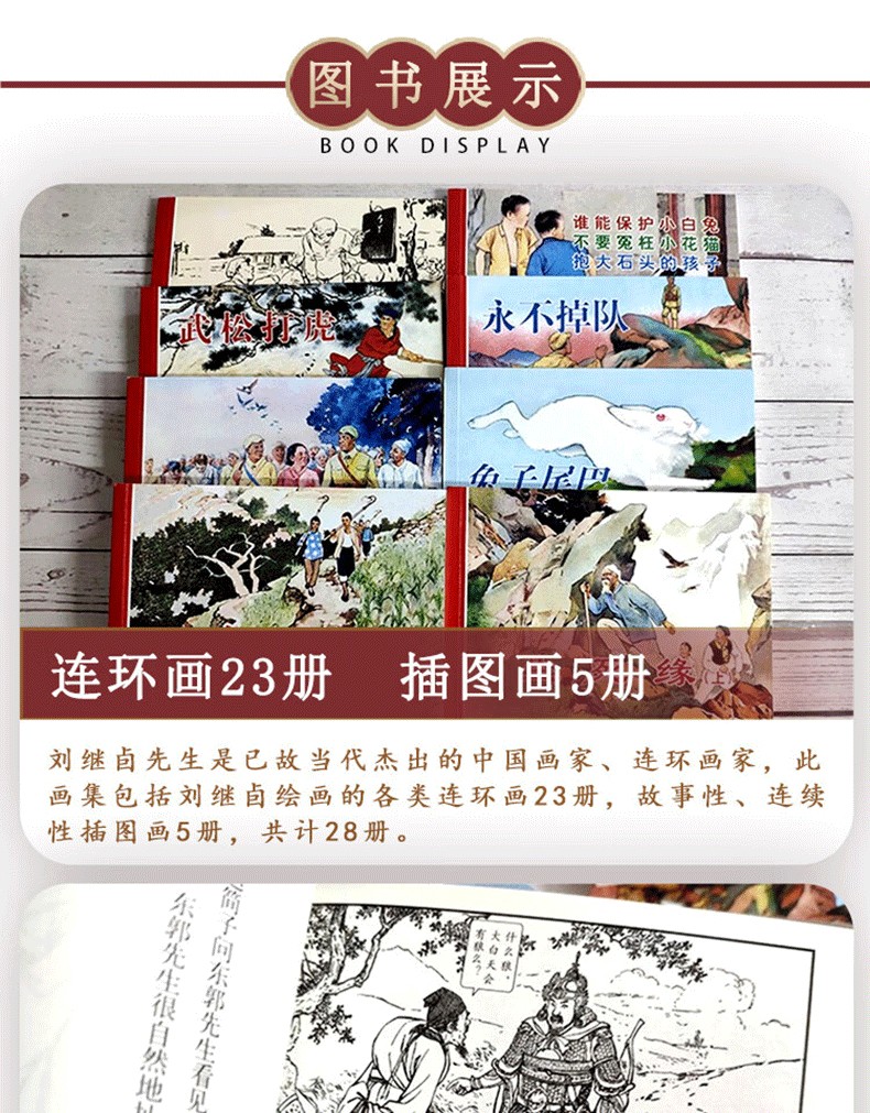 此全集,盡力收集了劉繼卣先生創作的各類連環圖畫23冊,故事性、連續性插圖畫5冊,共計28冊。合作繪畫的作品和署名不詳的作品(此類作品為數不多)未收入全集,在此一併說明,敬請諒解。
