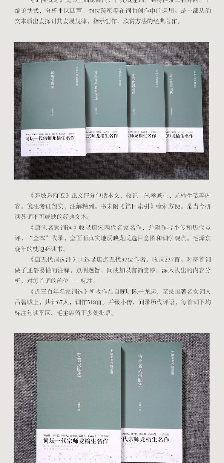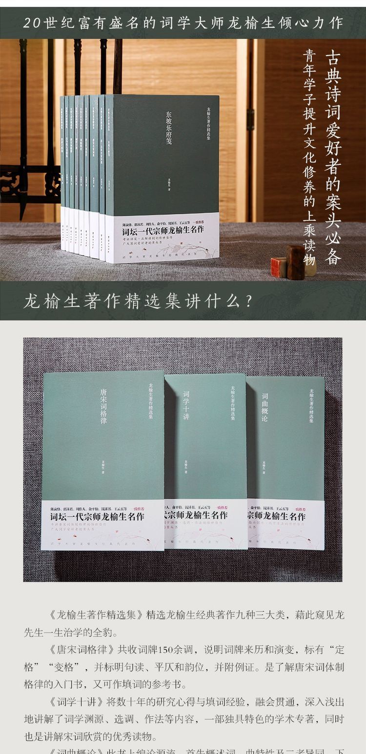 這套《龍榆生著作精選集》我們精選了其經典著作九種。在概論中,我們選擇了他晚年有代表性的《唐宋詞格律》《詞曲概論》《詞學十講》三種;選本則選擇《東坡樂府箋》《唐宋名家詞選》《唐五代詞選注》《近三百年名家詞選》四種;考慮到目前雅言弱化、語言表現力不足的現狀,還特意選擇了《古今名人書牘選》《蘇黃尺牘選》二種,作為學習文言文的補充讀本。讀者也可以藉此九種窺見龍先生一生治學的全豹。