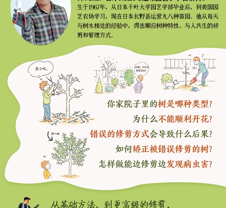 上條祐一郎,樹木醫生。生於1967年,從日本千葉大學園藝學部畢業後,至美國園藝農場學習,現於長野縣運營丸八種苗園。他從每天與樹木相處的經驗中,得出順應樹種特性、與人共生的修剪和管理方式。