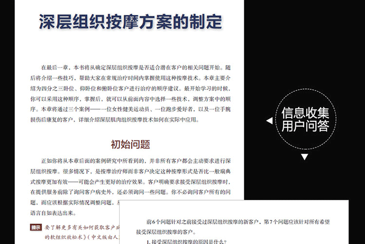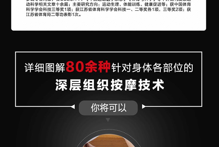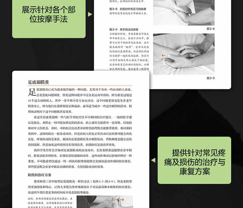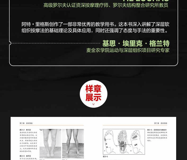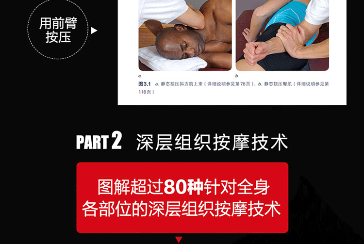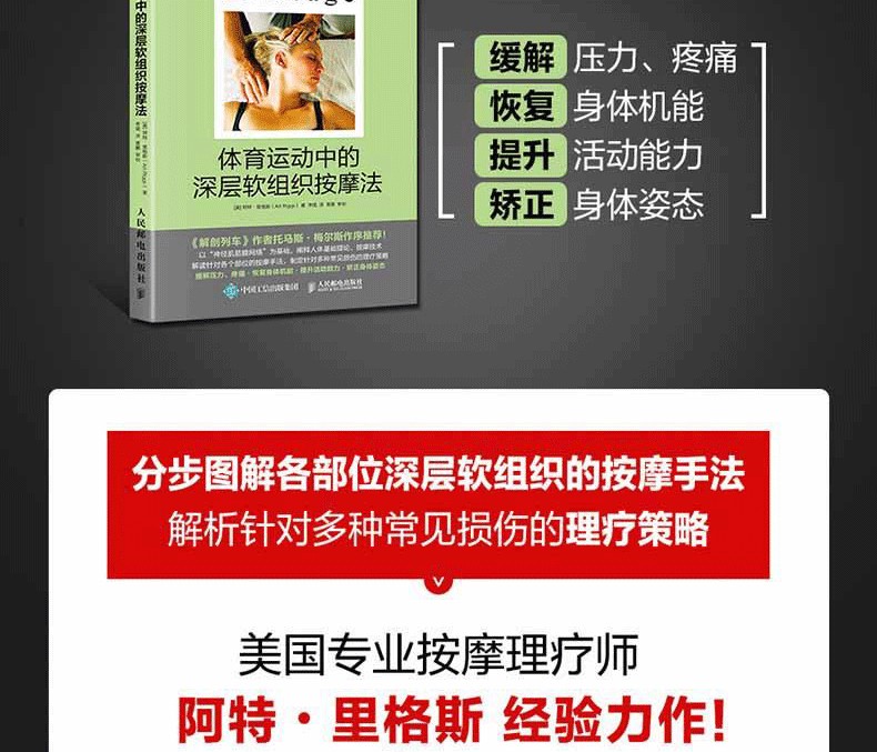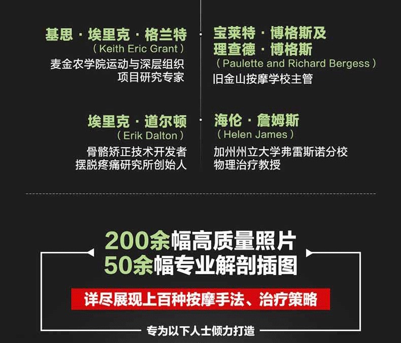 通過真人示範圖片與專業肌肉解剖圖相結合的方式,詳細介紹了深層軟組織按摩法的基礎理論及身體各部位按摩的步驟、力度、手法、注意事項及作用肌肉等,並提供了針對多種常見損傷的理療策略。