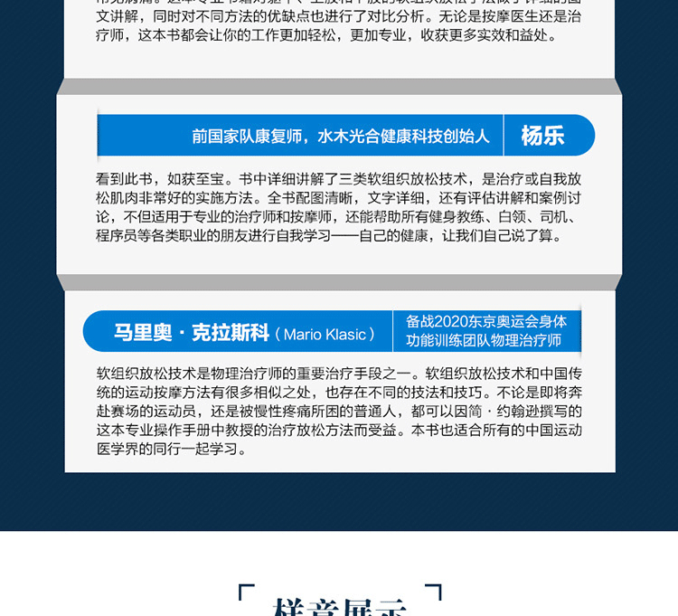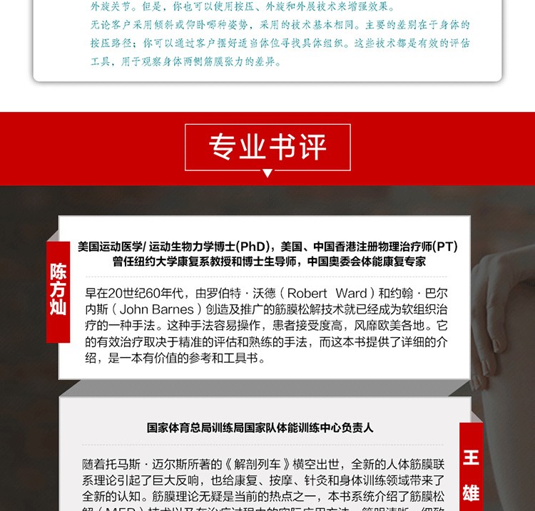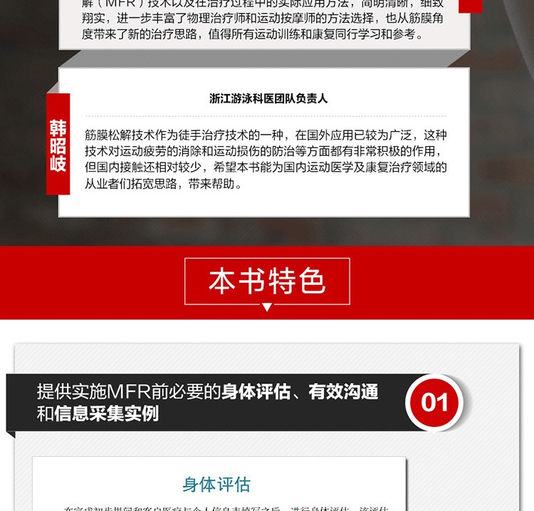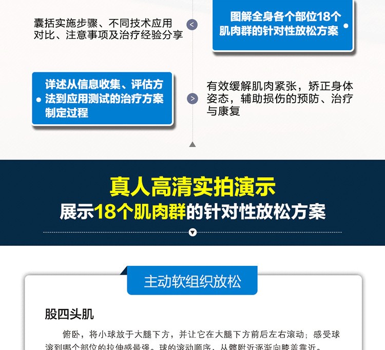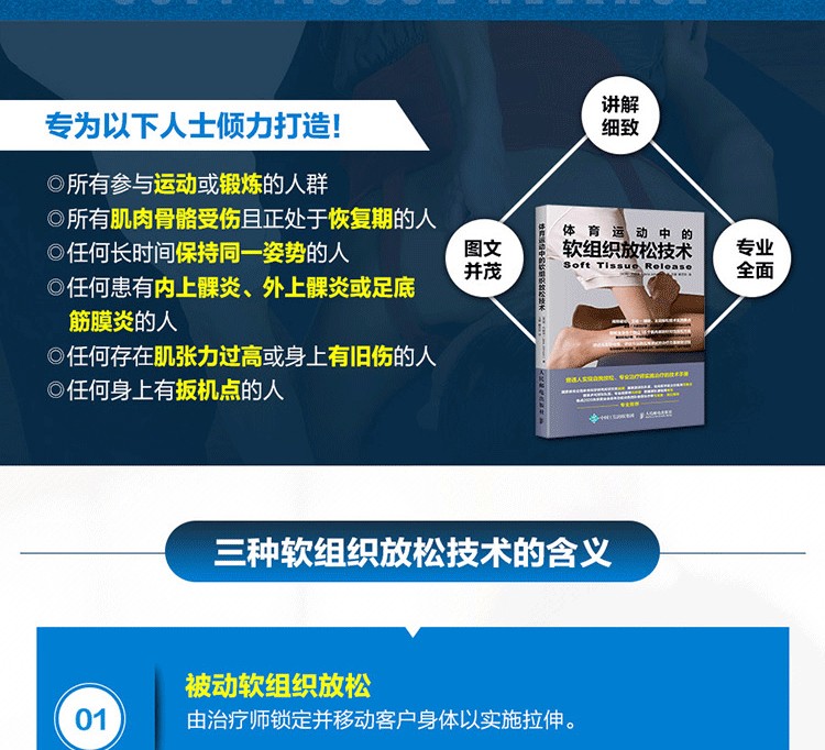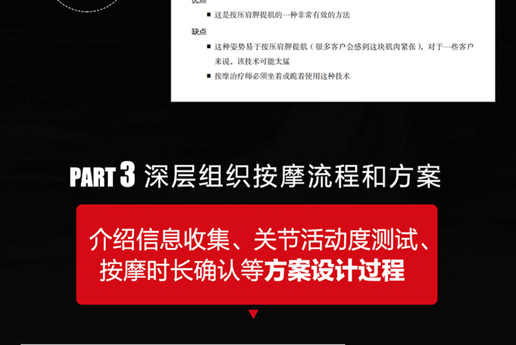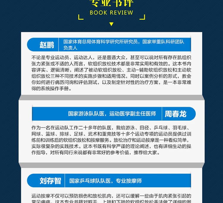 通過真人示範圖片與專業肌肉解剖圖相結合的方式,詳細介紹了深層軟組織按摩法的基礎理論及身體各部位按摩的步驟、力度、手法、注意事項及作用肌肉等,並提供了針對多種常見損傷的理療策略。