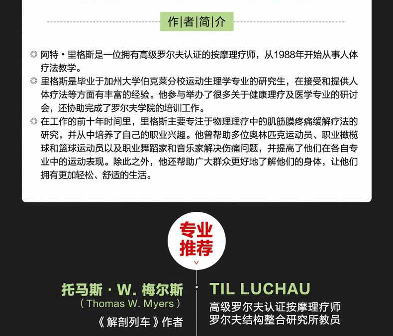 阿特·里格斯(Art Riggs) 阿特·里格斯是一位擁有*級羅爾夫認證的知名按摩理療師,他從1988年開始執教人體療法教學。他個人身體活動上的問題及對高難度運動的追求,包括馬拉松,讓他開始對人體療法產生興趣,並從開始的診室接待員到學生做起。他在接受、提供人體療法等方面有完整的經驗。他畢業於加州大學伯克萊分校運動生理學專業,獲得碩士學位,他的整個生涯都作為一名羅爾夫按摩治療工作者及深層軟組織按摩教師。他舉辦了很多關於健康理療及醫學專業的研討會,包括物理治療,更協助完成了羅爾夫學院的培訓工作。在工作的前十年時間裡,里格斯主要專注於物理理療中的肌筋膜疼痛緩解,並從中培養了自己的職業興趣。他曾幫助多位奧林匹克運動員、職業橄欖球和籃球運動員以及職業舞蹈家和音樂家解決了問題,提高了他們在各自專業中的狀態。除此之外,他還幫助廣大群眾更好地了解他們的身體,讓他們擁有更加輕鬆、舒適地進行每天的生活,這其中佔據了他主要的工作時間。