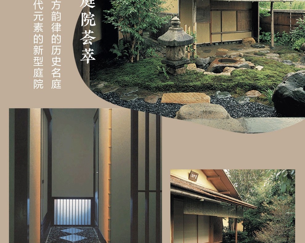 坪庭的歷史可追溯至平安時代的「藤壺庭」與「荻壺庭」。 歷代寺社庭院、茶庭的意象與建造手法皆可用於打造坪庭。 燈籠、蹲踞、一石一木皆凝結著造庭者的匠心,在狹小的空間中形成縮景,再現季節的變化。 玄關庭院附屬於玄關,它既是建築物的一部分,又可單獨成景。 鋪路石與踏腳石是構成玄關庭院的靈魂要素,其佈局極富功能性又不乏美觀性,引導訪客進入室內空間。