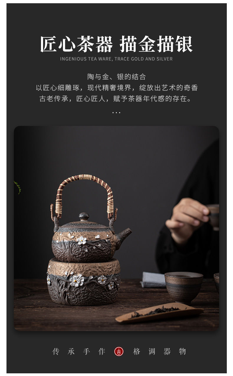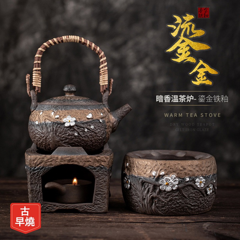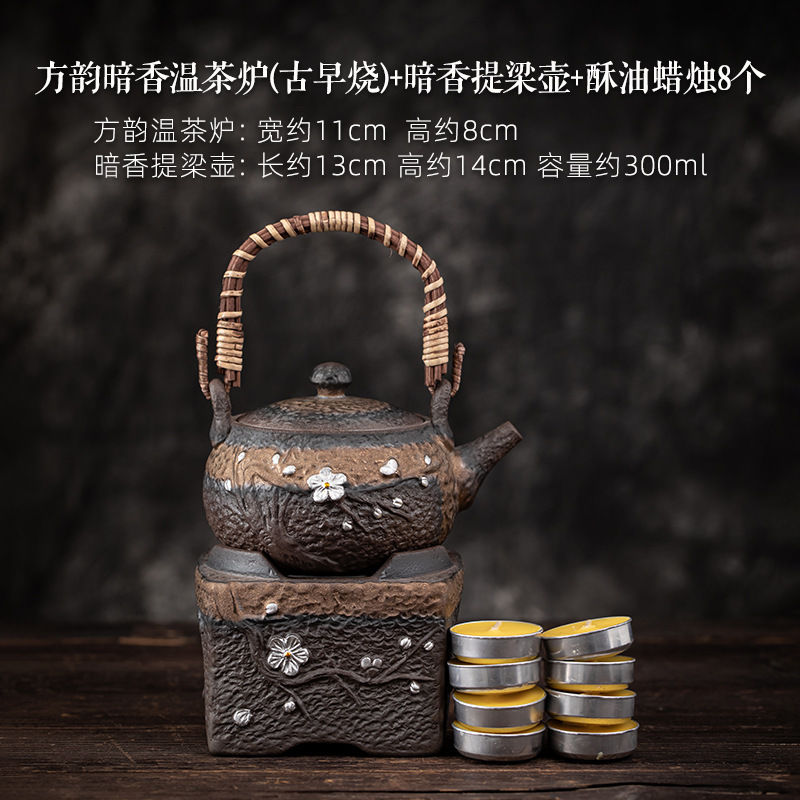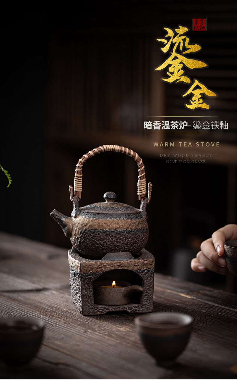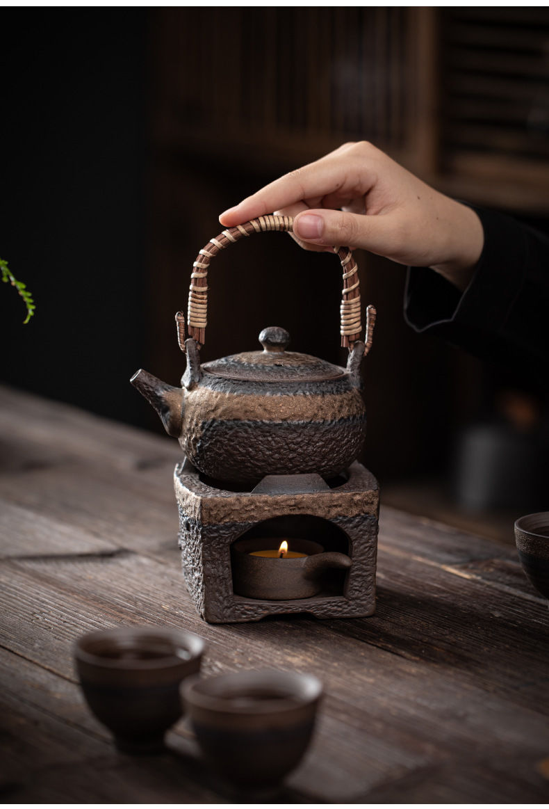 日式手工粗陶鐵釉籐編提梁壺(300cc)
