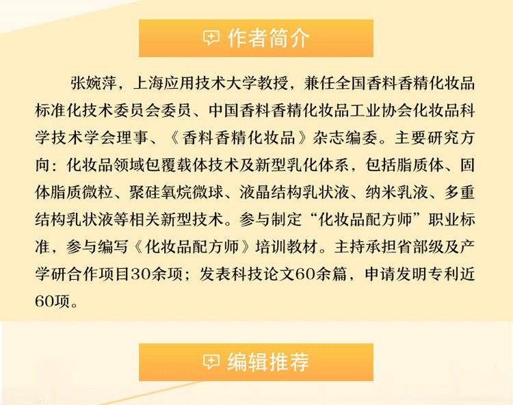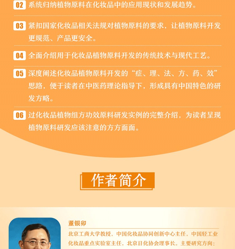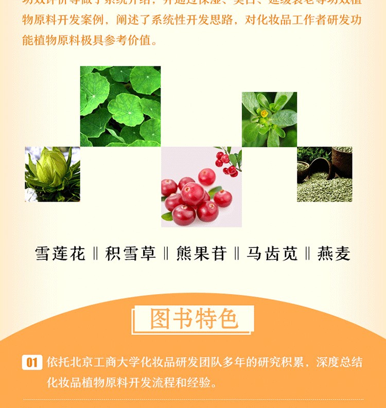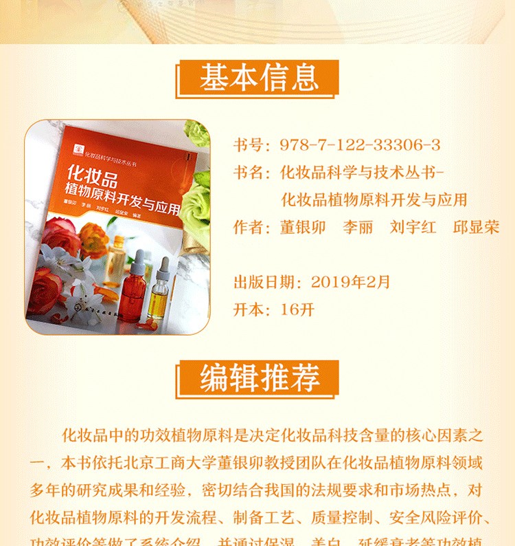 本書內容豐富,兼具理論性和實用性,可作為化妝品專業本科生的教科書、化妝品配方師的指導書、化妝品相關專業人員的參考書,同時可作為化妝品功效植物原料研發人員的培訓教材。