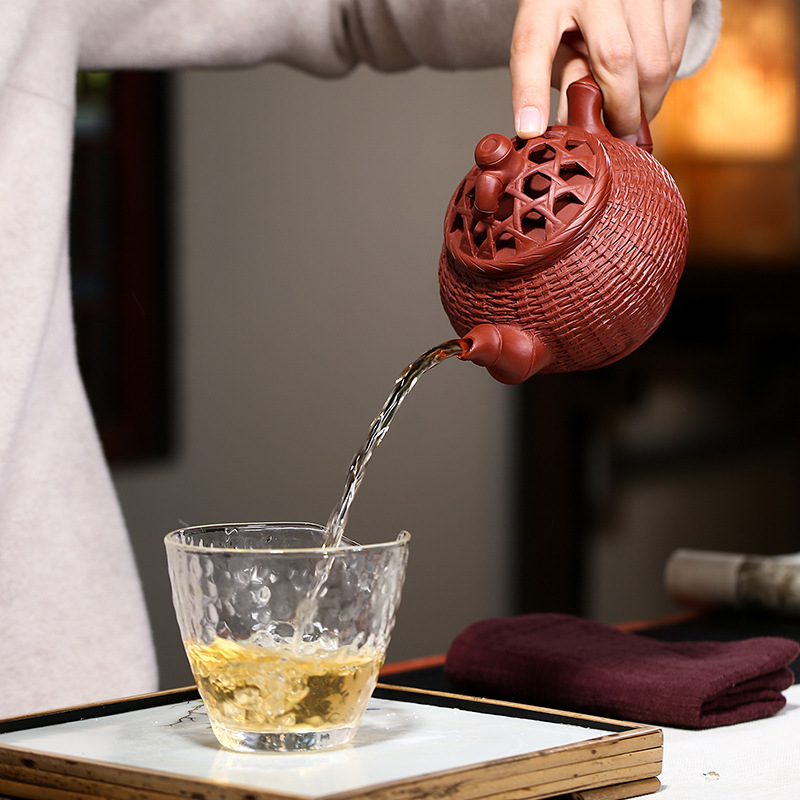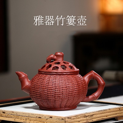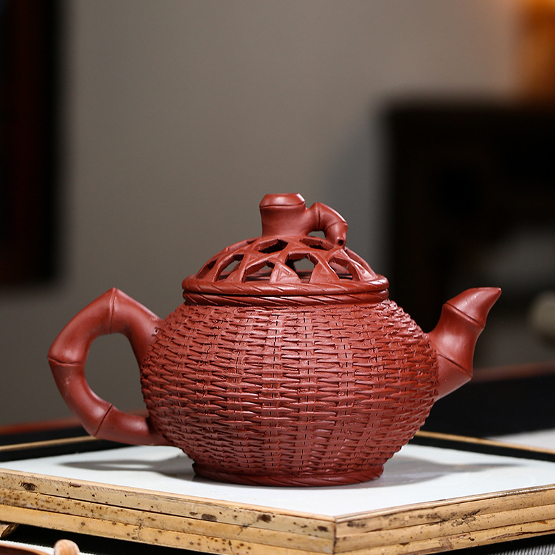 小紅泥鏤空金蟬竹簍紫砂壺