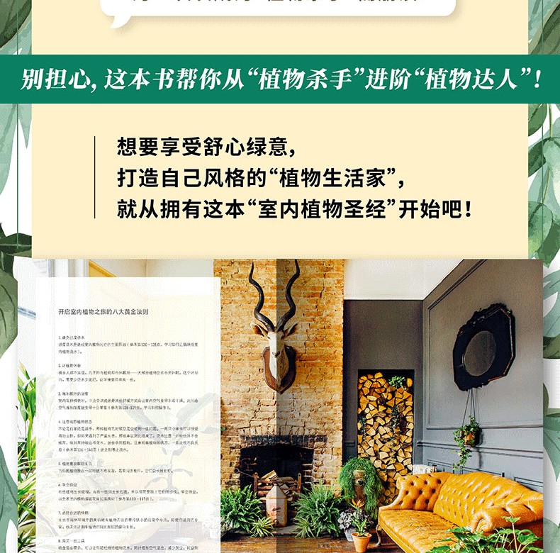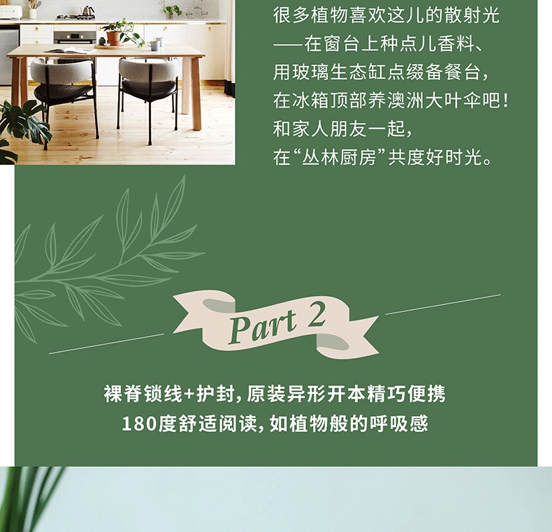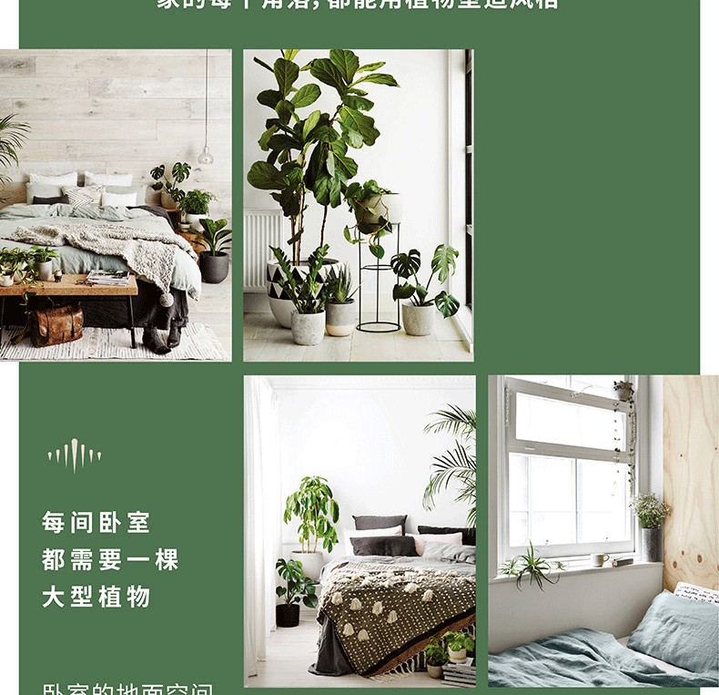 3. 案例輕鬆復刻,實用貼心!兩位作者將日常生活中可能遇到的問題,給出了實用的解決方案:空間不同,功能不同,植物的選擇和搭配也要各有特色:臥室的地面往往比較緊張,但牆面很空,立一棵高大的觀葉植物是填補空白的好點子,讓你在每天醒來時沐浴綠色的晨光;浴室實用卻無聊,是缺乏視覺焦點的小空間?不妨在浴室牆上吊掛空氣鳳梨,這種垂瀉而下的植物,很適合簡單的小空間……