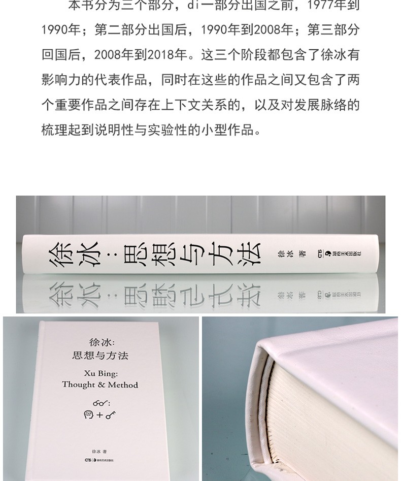 本書分為三個部分,第一部分出國前,1977年到1990年;第二部分出國後,1990年到2008年;第三部分回國後,2008年到2018年。 這三個階段都包含了徐冰重要的並有影響力的代表作品,同時在這些重要的作品之間又包含了兩個重要作品之間存在上下文關係的,以及對發展脈絡的梳理起到說明 性與實驗性的小型作品。