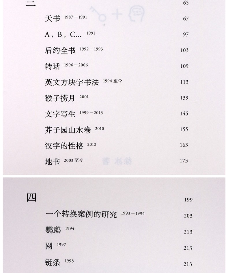 這本書是著名藝術家徐冰在國內第一本全面的、帶有研究性的、圖文並茂的作品集,也是他迄今為止對自己藝術生涯最全面、最深度的梳理和總結。 全書以時間線索為主軸,全面梳理藝術家自上世紀七十年代開始,至今四十餘年的創作歷程,囊括以版畫、素描、裝置、文獻記錄、手稿、影像、紀錄片等為形式的六十餘件 作品,勾勒出藝術家藝術探索的完整軌跡,展現藝術家的想法與方法。