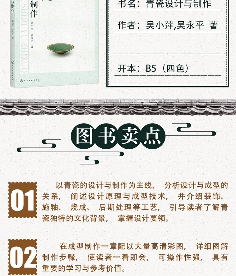 本書以青瓷的設計與製作為主線,分析設計與成型的關係,闡述設計原理與成型技術,並介紹裝飾、施釉、燒成、後期處理等工藝,配以製作過程的詳細步驟圖解,引導讀者了解青瓷獨特的文化背景,掌握設計要領,學習成型製作的全過程。