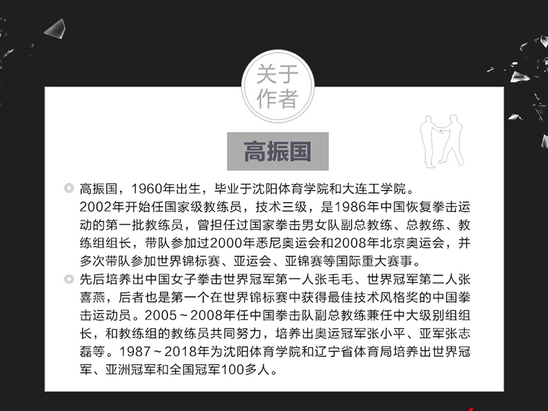 高振國,1960年出生,畢業於瀋陽體育學院和大連工學院。 2002年開始任 教練員,技術三級,是1986年中國恢復拳擊運動的 批教練員,曾擔任過 拳擊男女隊副總教練、總教練、教練組組長,帶隊參加過2000年悉尼奧運會和2008年北京奧運會,並多次帶隊參加世界錦標賽、亞運會、亞錦賽等 重大賽事,先後培養出中國女子拳擊世界 人張毛毛、世界 第二人張喜燕,後者也是 個在世界錦標賽中獲得 佳技術風格獎的中國拳擊運動員。 2005~2008年任中國拳擊隊副總教練兼任中大級別組組長,和教練組的教練員共同努力,培養出奧運 張小平、亞軍張志磊等。 1987~ 2018年為瀋陽體育學院和遼寧省體育局培養出世界 、亞洲 和全國 100多人。