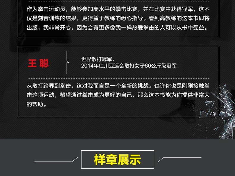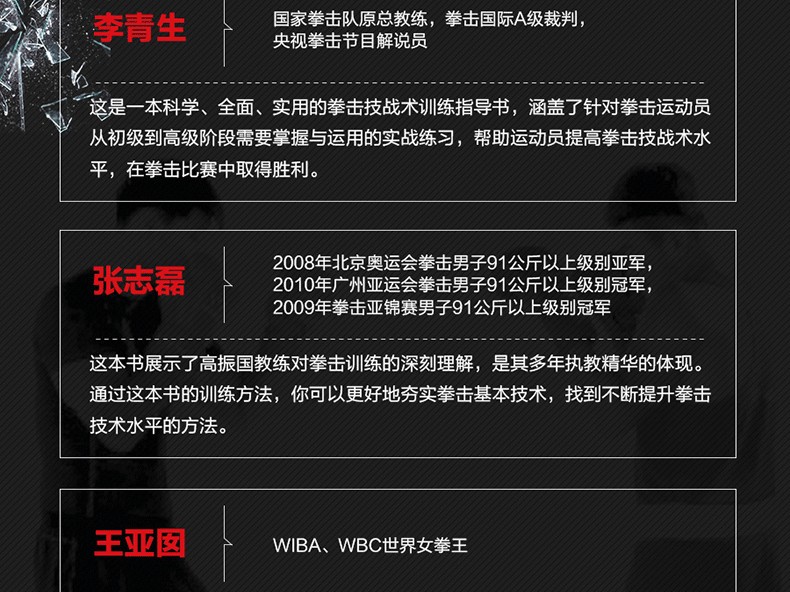 《拳擊運動從入門到精通(全彩圖解視頻學習版)》是拳擊奧運 教練超過30年執教專業運動員的經驗總結。全書對拳擊運動的新規則、裝備、訓練器材、訓練方法及技戰術應用做了系統介紹。書中採用專業選手示範圖例,教練講解技術要領的形式為讀者呈現所有技戰術動作,同時配有動作教學視頻,便於讀者 好地學習與實踐;另外書中還有針對拳擊運動常見問題的回答,是一本拳擊運動項目的工具書。無論是專業拳擊教練、運動員,還是大眾拳擊愛好者,都可以通過本書了解拳擊運動,在不斷探索中學習和提高拳擊技戰術水平。
