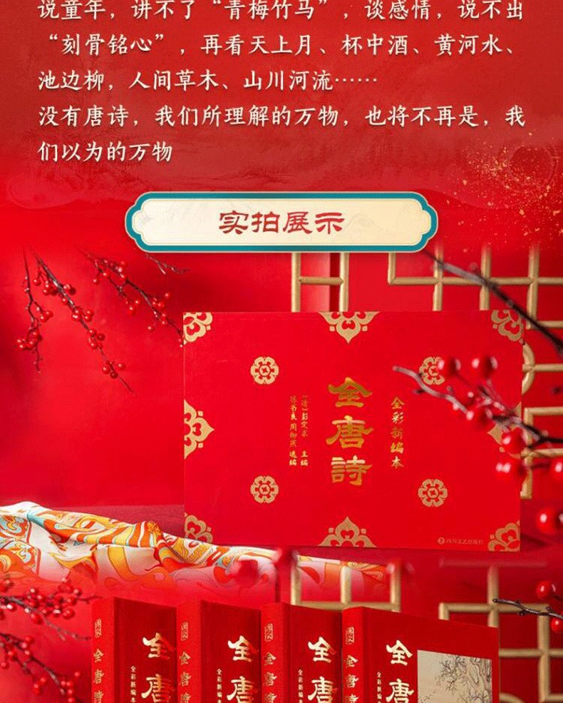 《全唐詩》全彩版,共四冊,初唐、盛唐、中唐、晚唐各一本。以道揚州詩局本及四庫全書本《禦定全唐詩》為底本,囊括了全部詩人2429人,原則上保證所有詩人收錄。並依詩歌流派分為:山水田園詩派、邊塞詩派、宮廷詩派、改革派等,收錄詩人代表作,剔除誤收的、殘斷的詩作,最終精選2873首詩歌,輔以詩人小傳、註釋及全彩插圖。詩人以其所在時代為準,按首字母排序,方便讀者查詢。