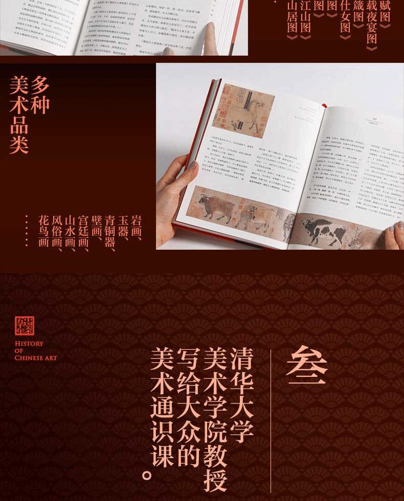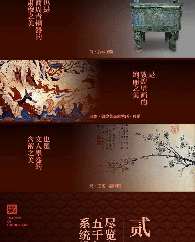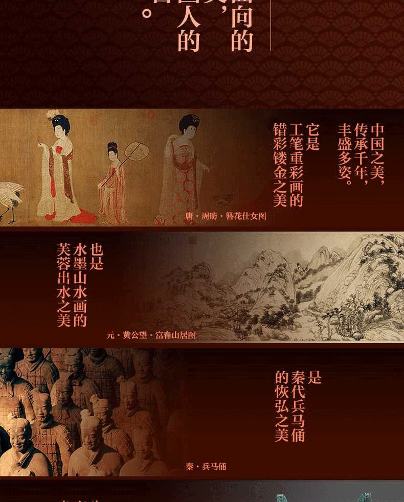領悟中國人獨有的美感範式,擁抱專屬國人的藝術殿堂。中國美術源遠流長、豐盛多姿,是宮廷仕女畫的錯彩鏤金之美,也是水墨山水畫的芙蓉出水之美;是皇家宮殿的雄壯之美,也是文人墨卷的含蓄之美;是商周青銅器的肅穆之美,也是漢代畫像磚的含蓄之美;是商周青銅器的肅穆之美,也是漢代畫像磚的拙之美……