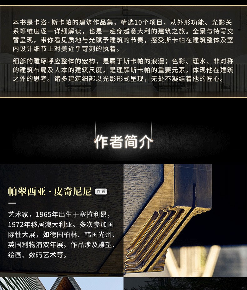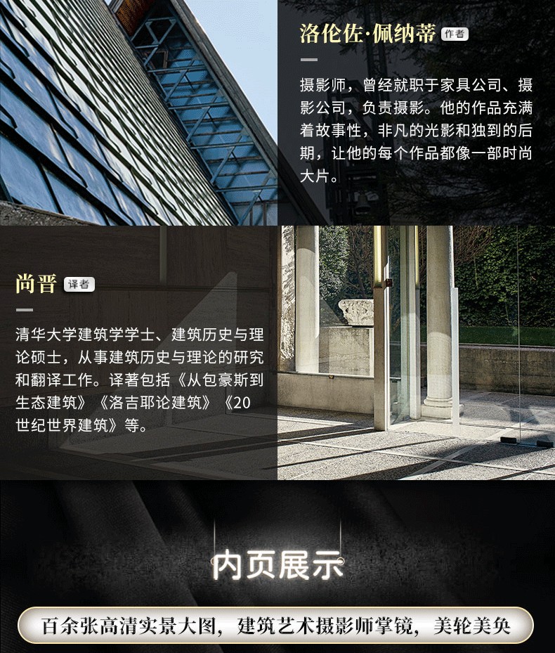 本書精選斯卡帕的十個建築項目,從建築的外形與功能、光影關係上對每部作品進行解讀,如同帶領讀者開啟了一場穿越威尼斯、維琴察、特雷維索、維羅納、 博洛尼亞的美學之旅。 藝術家皮奇尼尼拋開冰冷的建築圖和艱鉅的研究,將溫度融入建築之中,為建築解析帶來人文性的關懷視角。 書中照片由攝影師洛倫佐·佩納蒂(Lorenzo Pennati)拍攝,建築在整體與特寫之間交替呈現。 這些照片聚焦於公共場所,如博物館、商店、辦公大樓,探索質地、光賦予建築的節奏,以及簡單的線條所表達的詩意,向讀者展示了斯卡帕在建築整體以及室內設計細節方面對美 近乎苛刻的執著。 作者同時講述了斯卡帕設計生命的延續——兒子托比亞在修復一新的聖母教堂中為父親的作品開闢的一處展館,並在本書末尾為斯卡帕做傳。