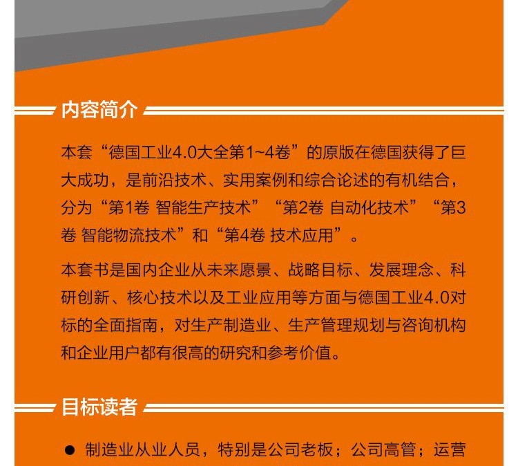 2014年本套“德國工業4.0大全 ~4卷”的版出版,名為《Industrie 4.0 in Produktion, Automatisierung und Logistik》,在工業4.0領域的專業文獻上邁出了重要的一步。但是,我們清楚地認識到,一本一直保持不變的書無法滿足當前技術快速發展的要求。因此,我們決定從第2版開始把版分為4卷,以建立德國工業4.0的框架。工業4.0如今在世界範圍內被廣泛討論並付諸實踐。本套書由一篇篇獨立的關於工業4.0在生產、物流和自動化領域中的課題文獻組成。第2版不僅對版的文獻進行了修訂,還在以下方面增加了許多新的文獻:價值生成的數字化工業4.0中的自動化應用場景信息物理系統的運行工業4.0中的工程應用自動化中的縱向和橫向集成工業4.0中的數據挖掘和數據分析及其法律問題工業4.0中的人與機器之間的相互作用作為信息物理系統一部分的智能電荷載......