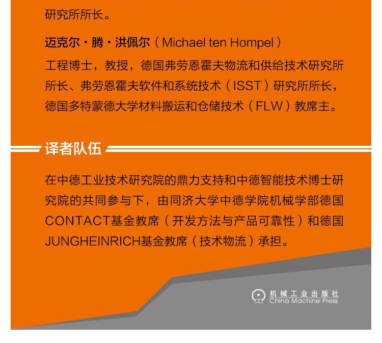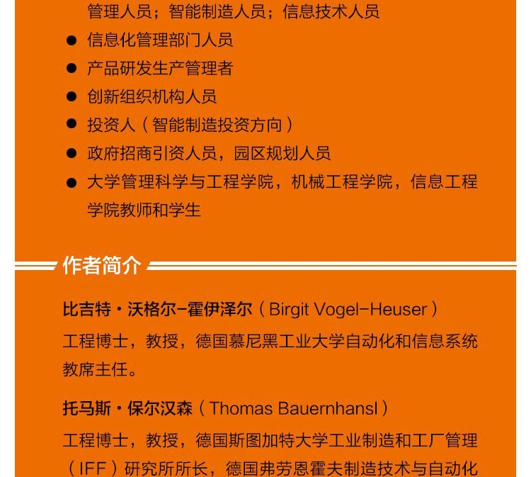 比吉特•沃格爾-霍伊澤爾(Birgit Vogel-Heuser),工程博士、教授,德國慕尼黑工業大學自動化和信息系統教席主任。托馬斯•保爾漢森(Thomas Bauernhansl),工程博士、教授,德國斯圖加特大學工業製造和工廠管理(IFF)研究所所長、德國弗勞恩霍夫製造技術與自動化研究所所長,以及聯邦政府工業4.0平台戰略策劃組成員、工業4.0聯盟的執行主席。邁克爾•騰•洪佩爾(Michael ten Hompel),工程博士、教授,弗勞恩霍夫物流和供給技術(GF)研究所所長、弗勞恩霍夫軟件和系統技術(ISST)研究所所長,以及德......