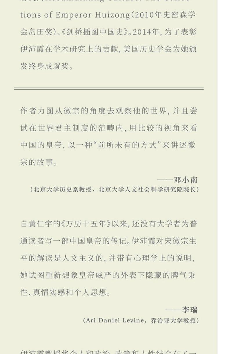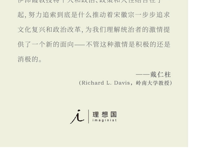伊沛霞教授將個人和政治、政策和人性結合在了一起,努力追索到底是什麼推動著宋徽宗一步步追求文化復興和政治改革,為我們理解統治者仍在灌輸的激情提供了一個新 的面向-不管這種激情是積極的還是消極的。