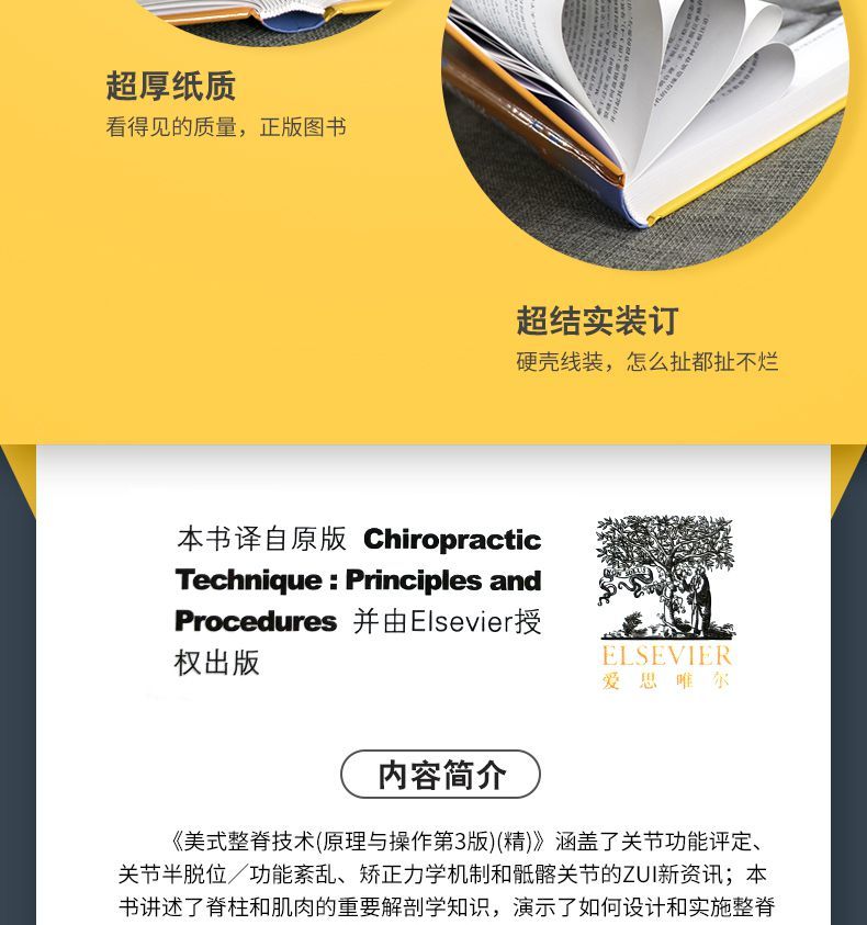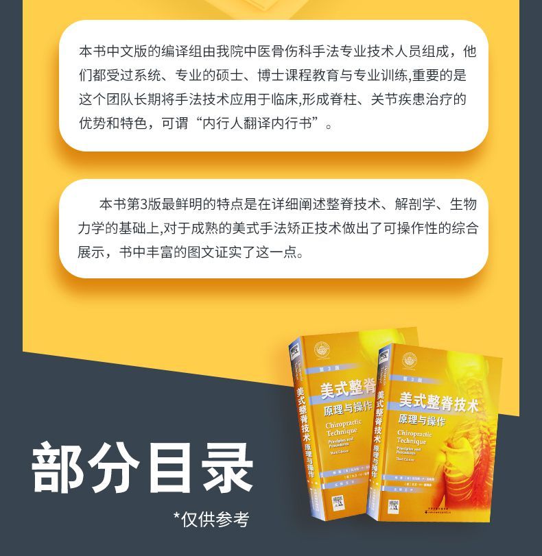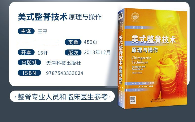《美式整脊技術:原理與操作(國外引進)(中文翻譯)(第3版)》是美國整脊專業考試的參考書,它由專家撰寫,以新的研究為基礎,使整脊技術的步驟變得更為清晰直觀,易於應用。這本書描述了整脊技術的基本原則,回顧了整脊行業的歷史,詳細描述了脊柱、骨盆和四肢的關節檢查方法和矯正技術,無疑是一本整脊專業學生和臨床醫生的必備參考書。