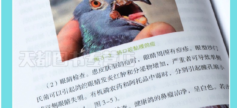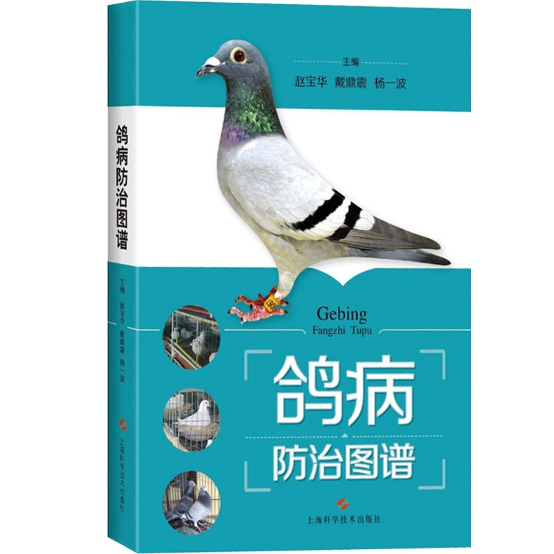 趙寶華、戴鼎震、楊一波主編的《鴿病防治圖譜(精)》內容包括鴿病綜合防治技術,鴿病毒性傳染病,鴿細菌、支原體、衣原體和真菌性傳染病,鴿寄生蟲病,鴿營養缺乏症與代謝疾病,鴿中毒性疾病,普通病及胚胎病,共六個部分。書中主要介紹了常見鴿 病的診斷和防治方法。在臨診症狀和病理變化部分配有大量典型圖片;在診斷部分除介紹常規診斷外,還有相似疾病的鑑別診斷,要點突出,有助於提高常見鴿病診斷的準確性,以便及時採取防治措施。