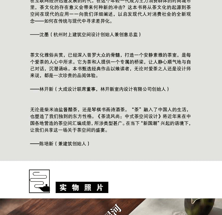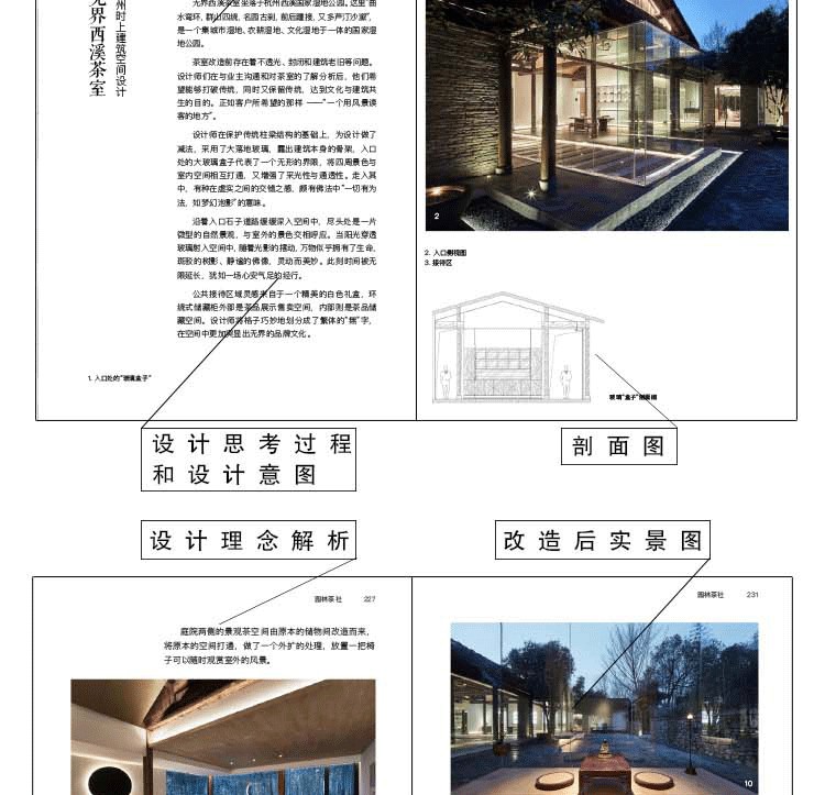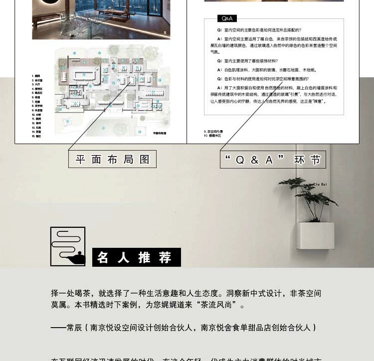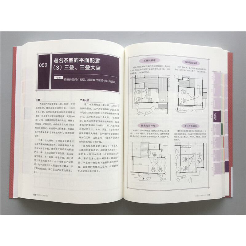 本書作者從茶道的歷史以及茶室在歷史中的演變開始介紹,再進一步詳盡地介紹實際建造茶室時的具體程序,如平面配置、施工方法及材料的選擇等等。並且透過專業的繪圖師,忠實地呈現茶室內外的格局及道具的樣貌,即便是對茶道或茶室接近陌生的讀者,也能很快且具體地掌握每個細節,同時也能透過圖文的解說領略日式工藝之美。最後一章則逐一介紹了日本從古至今有名的茶室,因為學習與模仿古人的作品,是茶室設計重要的基礎及創新靈感來源。此書講述了完整的茶道精神及茶室的建造方法,數據詳盡豐富,是從事日式空間設計的專業人士,及對日式建築及茶室空間有興趣的讀者,不可或缺的一本實用工具書籍。