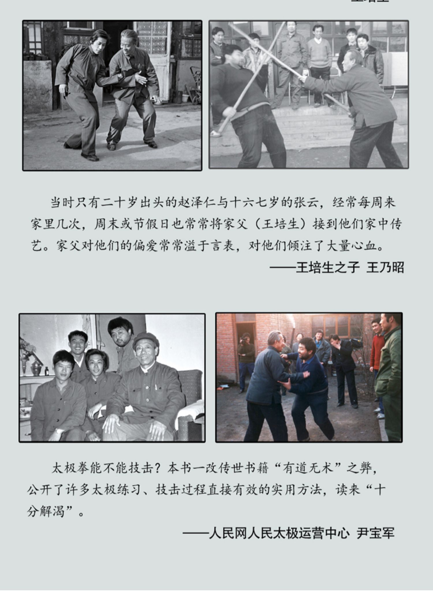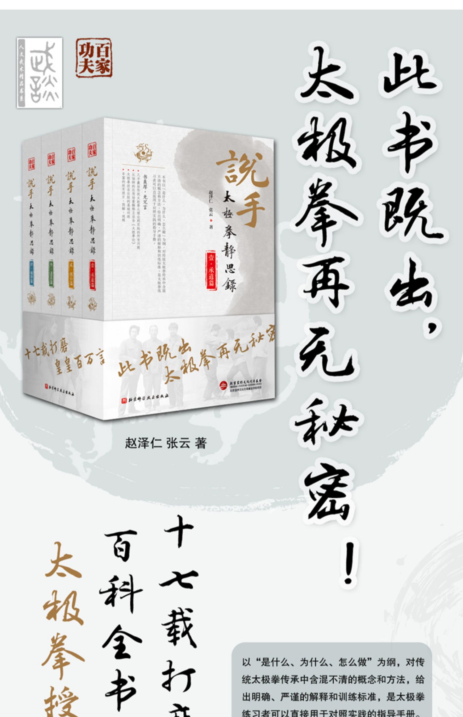 一部2019年即將問世的百科全書式的煌煌巨著。趙澤仁、張雲兩位作者盡得武學大師王培生先生真傳,拳術散手刀槍劍棍,無所不精;視野見聞實戰,堪稱一時之選。此書從經驗中昇華出智慧,披露太極門中三口不說、六耳不傳奧義,展示精修拳藝數十年的獨得之秘,詳解從入門到大成的太極各階段功夫,“字字真切義無遺”,提要鉤玄,體用兼備,是太極拳著作中之作。