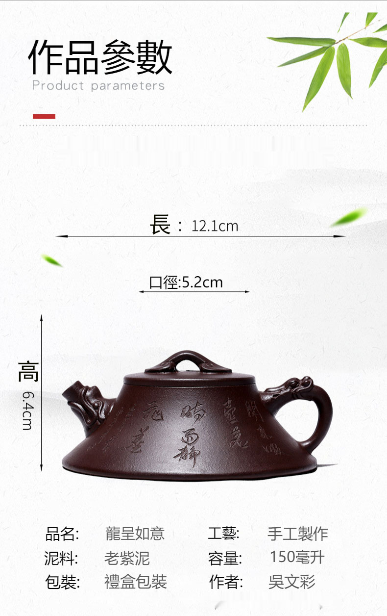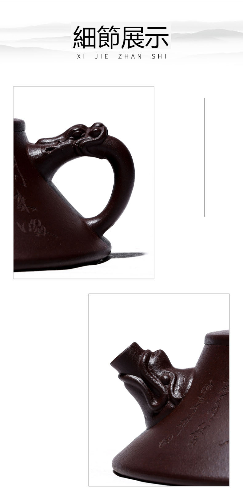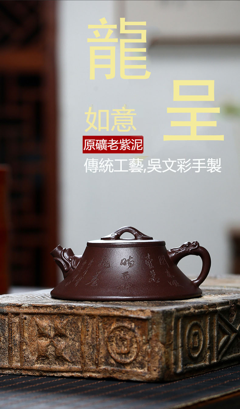 【簡介】龍呈如意壺造型古樸別緻,韻味十足。以傳統為基礎,線條厚重,輪廓清楚洗練,讓人感覺歷經時間打磨和淘洗。壺底圈足,沉穩中透著端莊氣息。壺蓋平滑而富有層次感,嘴、把、均以龍形設計,點明主題,又像徵吉祥之意。