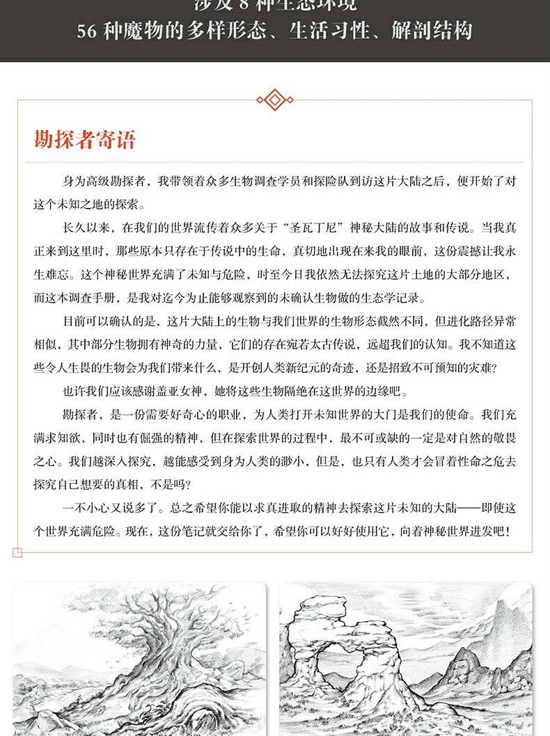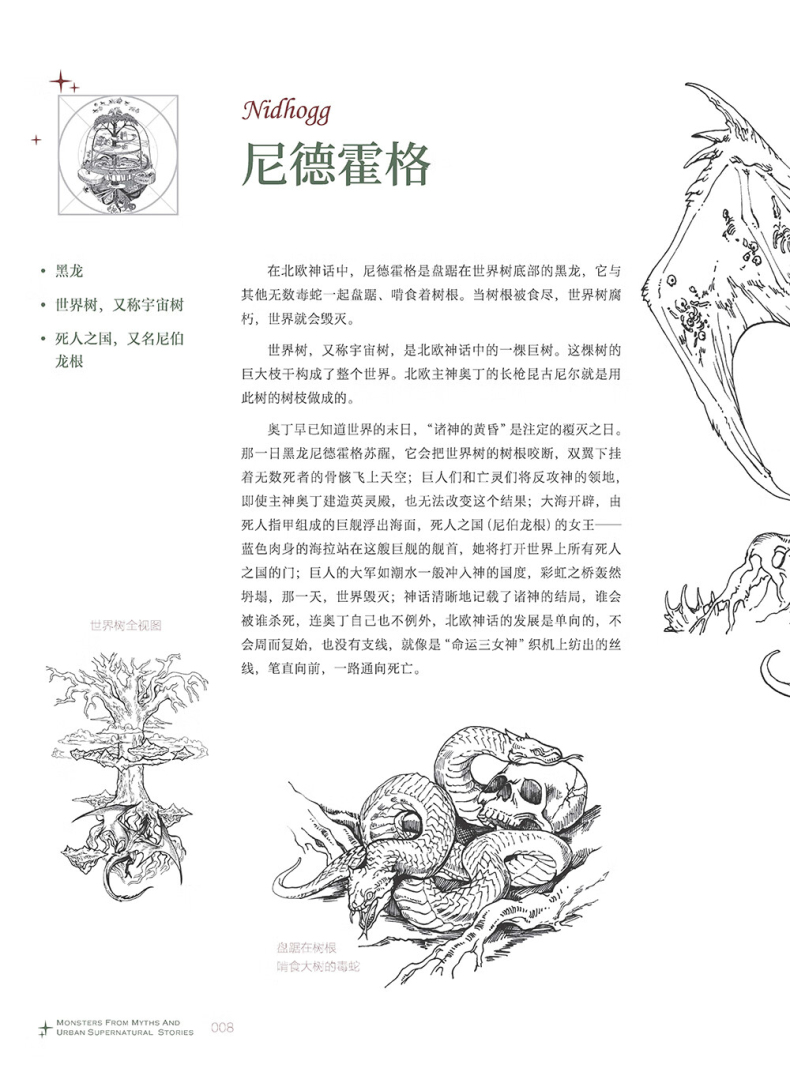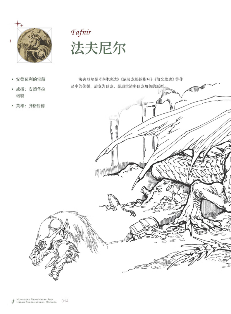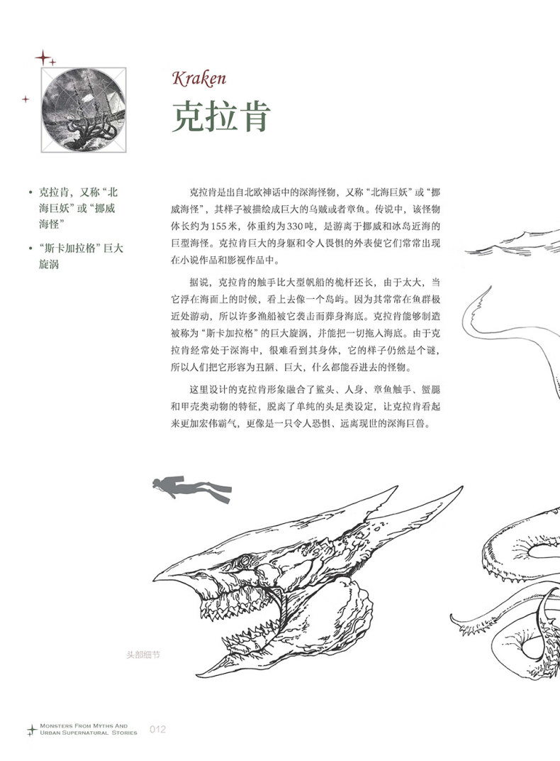 本書綜合各種神話傳說,集合了各種怪物,共分為7章,包含8個北歐神話怪物、17個希臘神話怪物、5個古埃及神話怪物、5個印度神話怪物、9個歐洲志怪傳說怪物 、33個當代神秘生物傳說怪物,以及個人作品展示。 書中羅列了各種怪物的特徵並呈現了與其相關的故事,可以讓讀者了解它們並遨遊於神奇的世界。